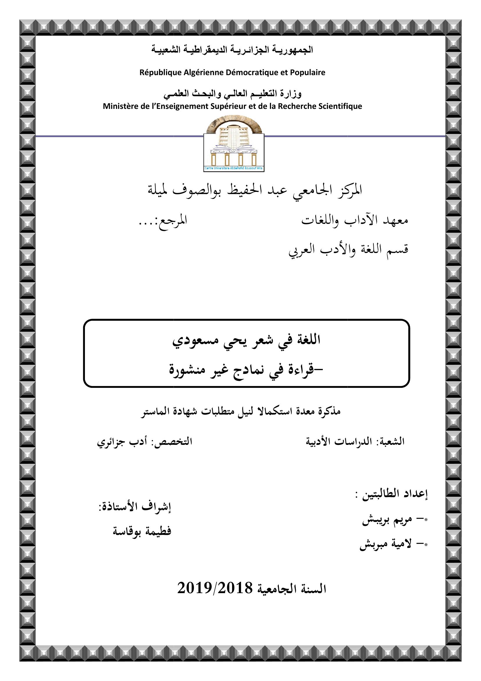 بريبش مريم & بوقاسة فطيمة ( مشرفا) (2019). اللغة في شعر يحي مسعودي -قراءة في نمادج غير منشورة-.