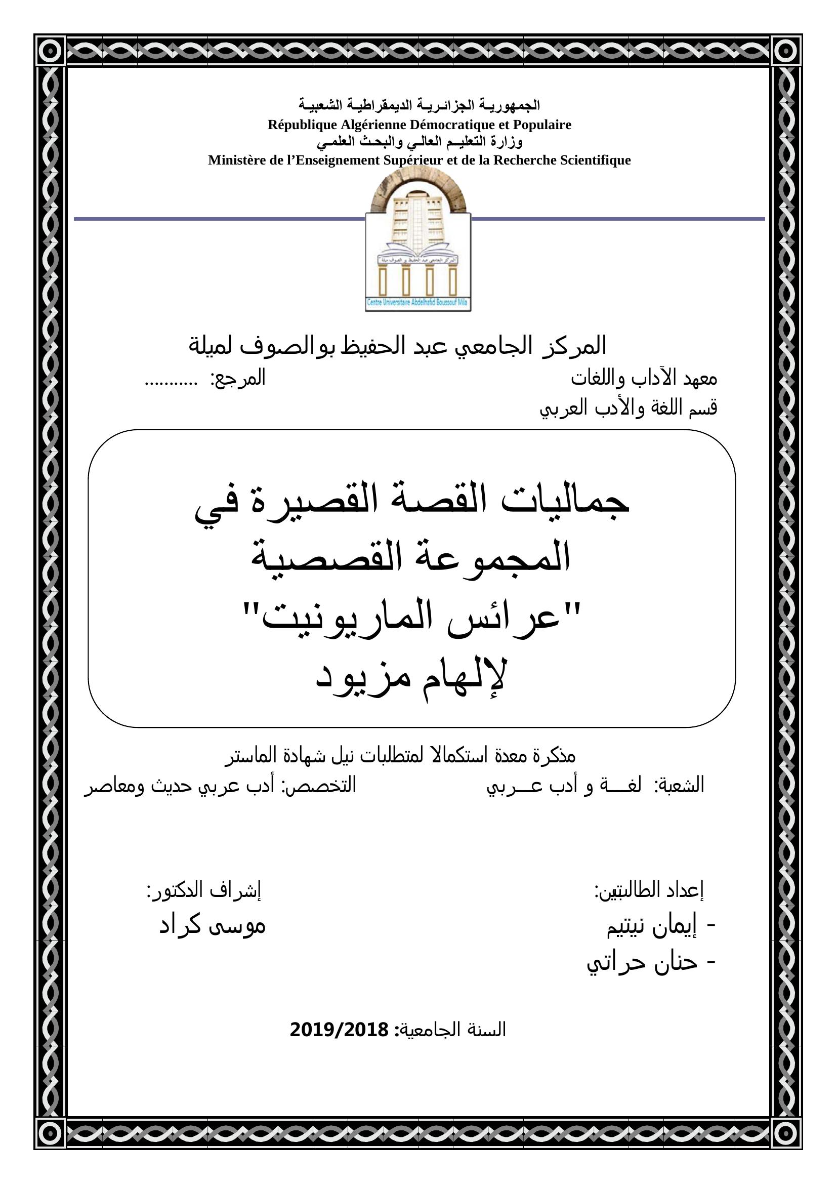نيتيم ايمان & كراد موسى (مشرفا) (2019). جمالية القصة القصيرة في المجموعة القصصية "عرائس الماريونت"لإلهام مزيود.
