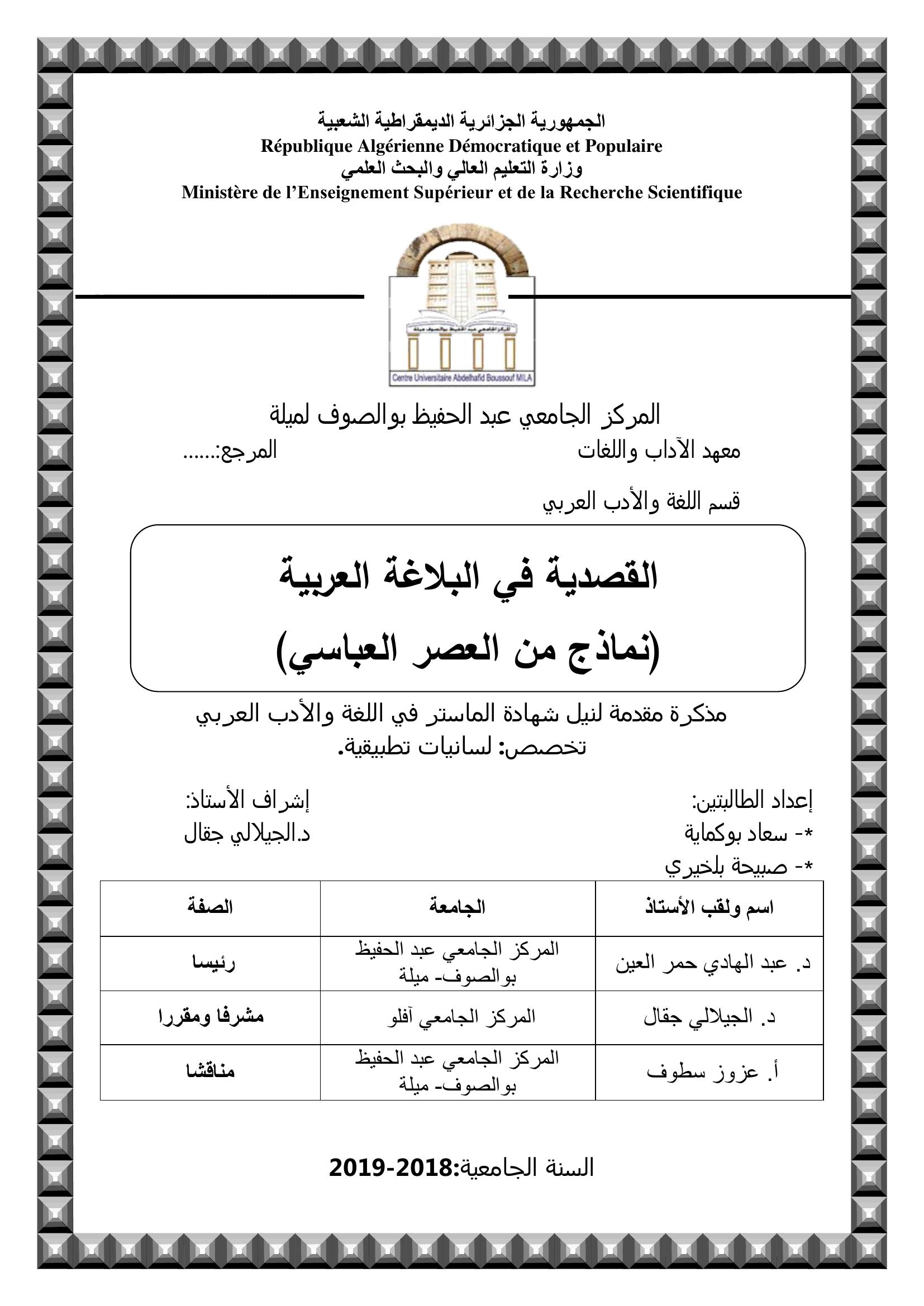 بوكماية سعاد & الجيلالي جقال (2019). القصيدةفي البلاغة العربية -نمادج من العصر العباسي-.