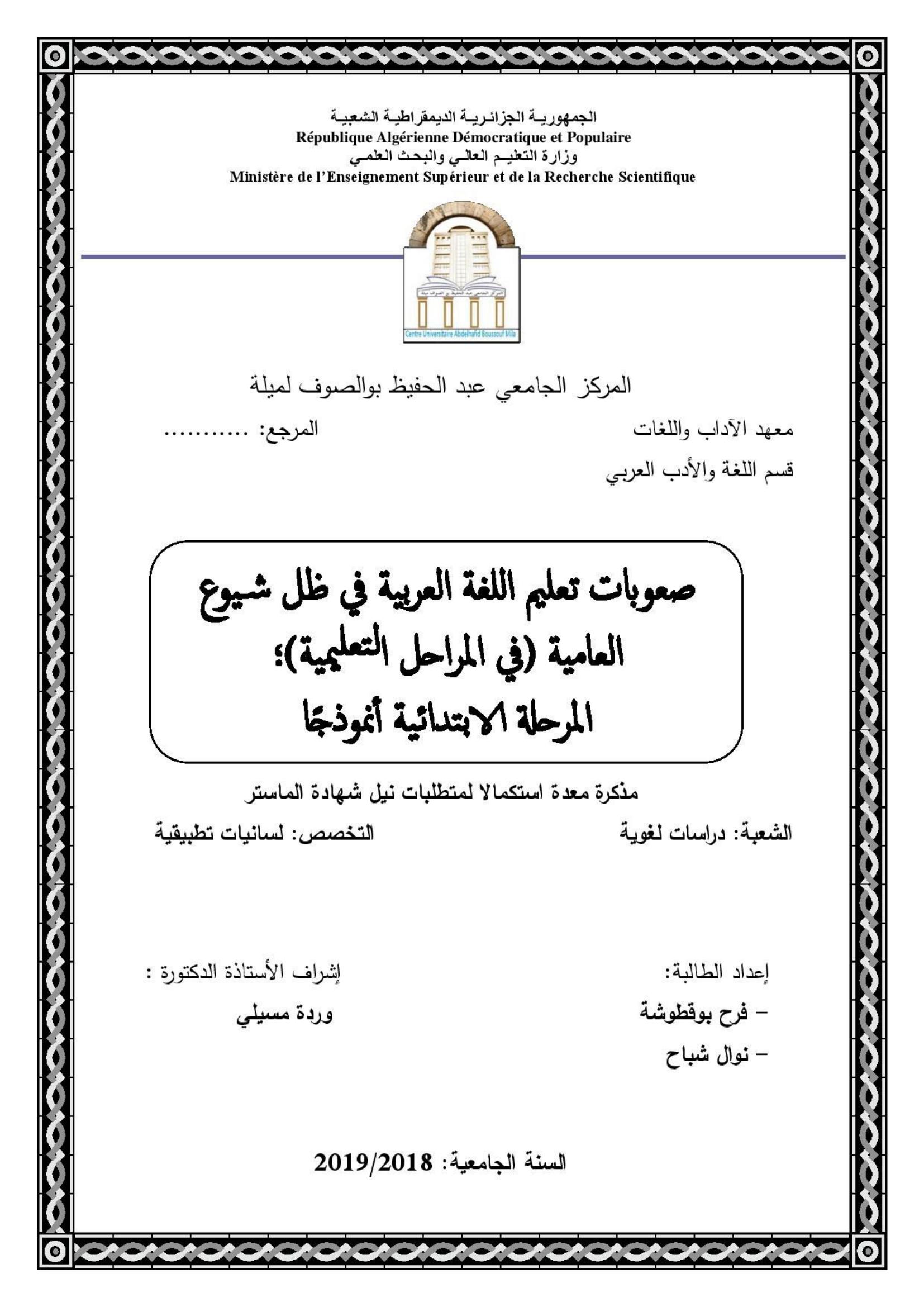 بوقطوشة فرح & مسيلي وردة (مشرفا) (2019). صعوبات تعليم اللغة العربية في ظل شيوع العامية في النراحل التعليمية -المرحلة الابتدائية انمودجا.