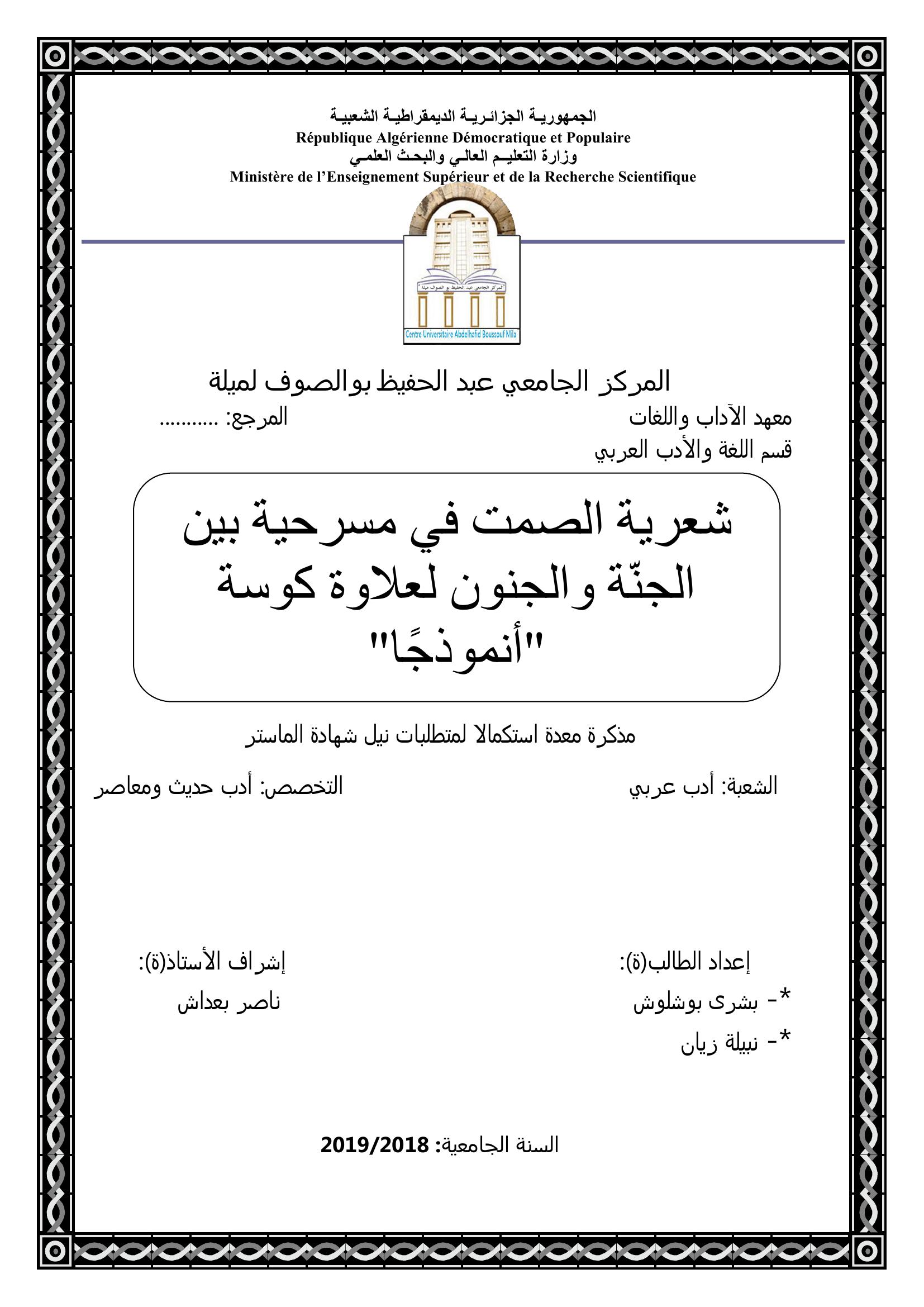 بوشلوش بشرى & بعداش ناصر (مشرفا) (2019). شعرية الصمت في مسرحية بين الجنة والجنون لعلاوة كوسة -انمودجا-.