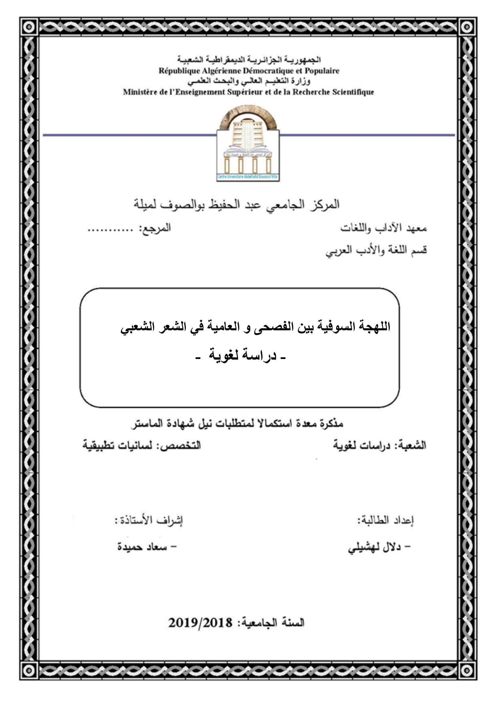 لهشيلي دلال & حميدة سعاد(مشرفا) (2019). اللهجة السوفية بين الفصحى والعامية في الشعر الشعبي -دراسة لغوية-.