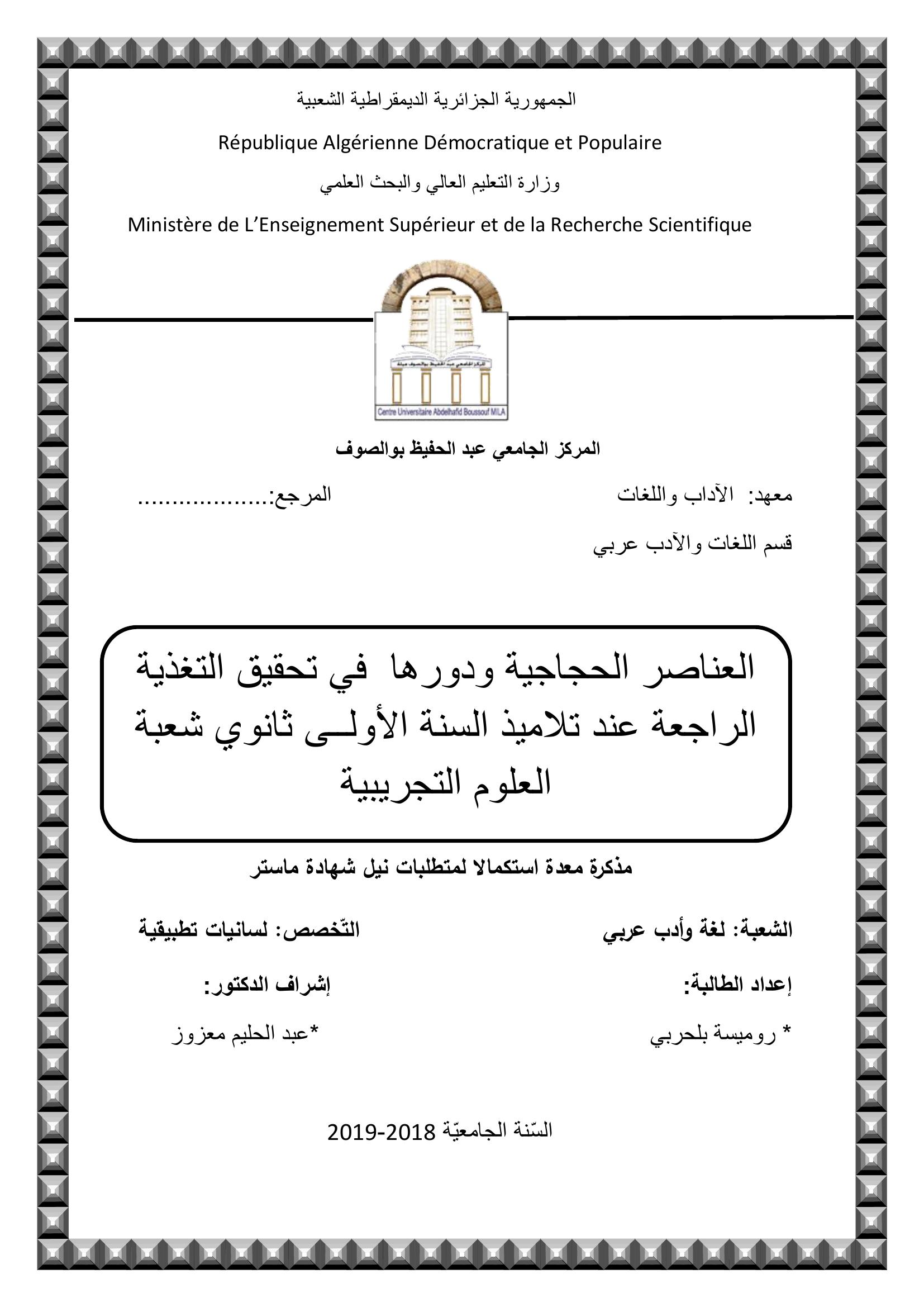 بلحربي رومسية & معزوز عبد الحليم (مشرفا) (2019). العناصر الحجاجية ودورها في تحقيق التغذية الراجعة عند تلاميذ السنة الأولى ثانوي شعبة العلوم التجريبية.