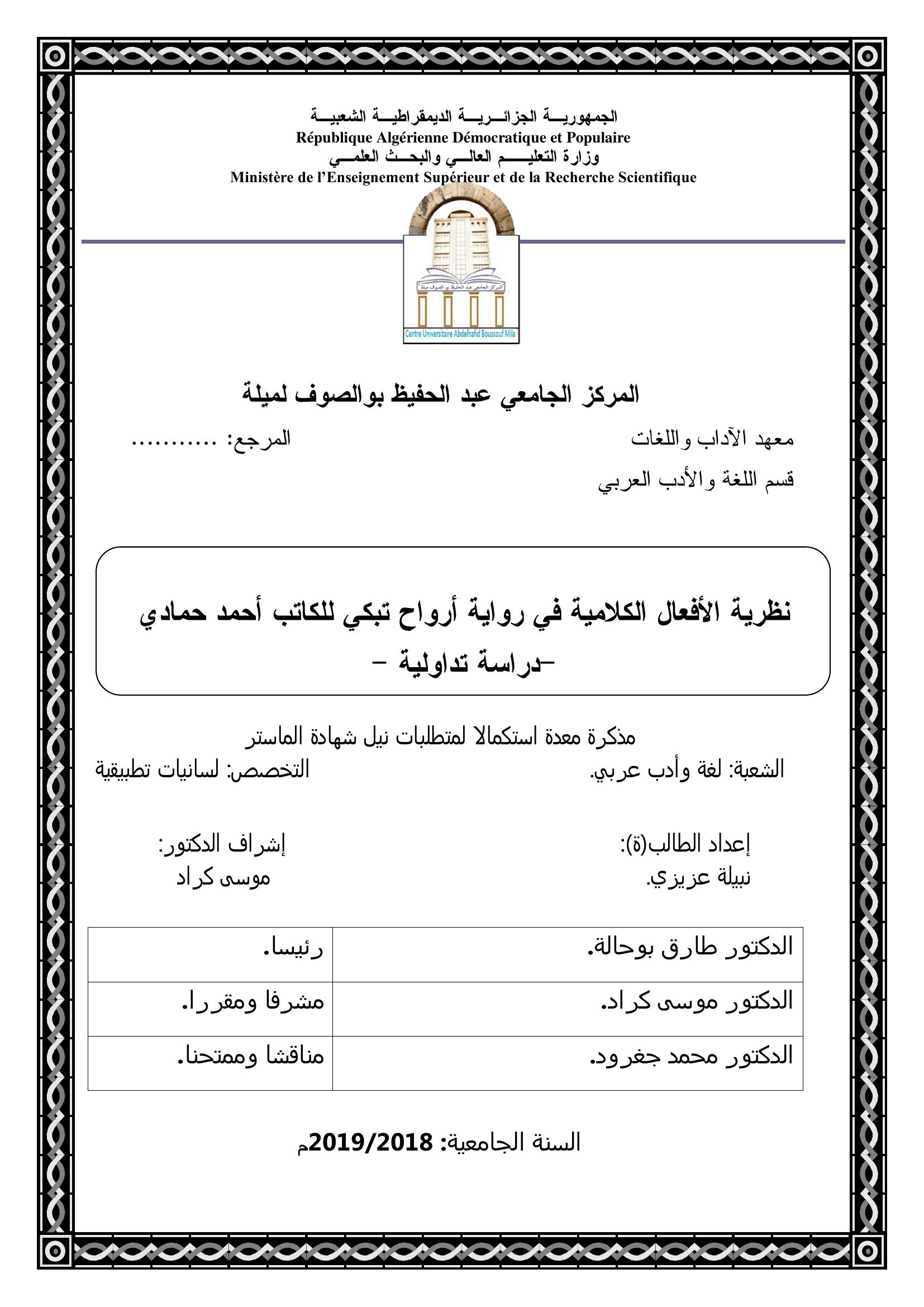 عزيزي نبيلة & كراد موسى (مشرفا) (2019). نظرية الافعال الكلامية في رواية أرواح تبكي للكاتب أحمد حمادي -دراسة تداولية -.