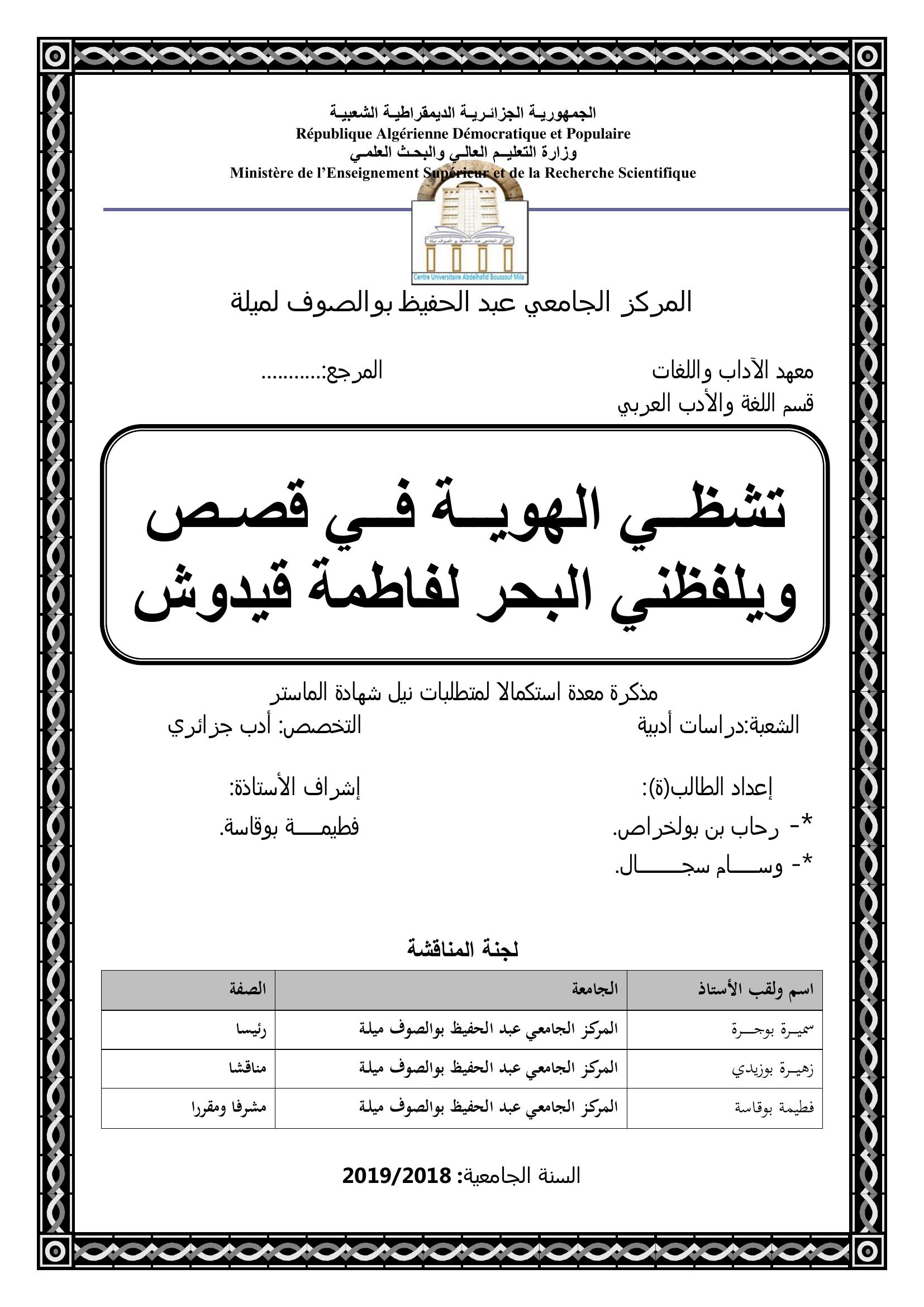 بن بولخراص رحاب & بوقاسة فطيمة ( مشرفا) (2019). تشظي الهوية في قصص ويلفظني البحر لفاطمة قيدوش.