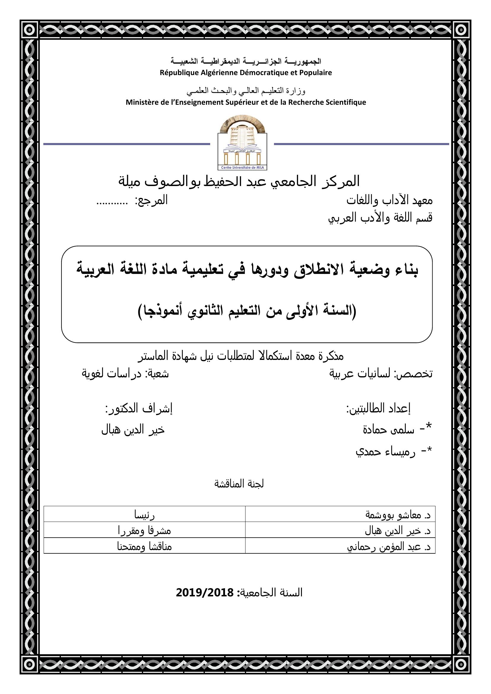 حمادة سلمى & هبال خير الدين (مشرفا) (2019). بناء وضعية الانطلاق ودورها في تعليمية مادة اللغة العربية -السنة الاولى من التعليم الثانوي انمودجا.