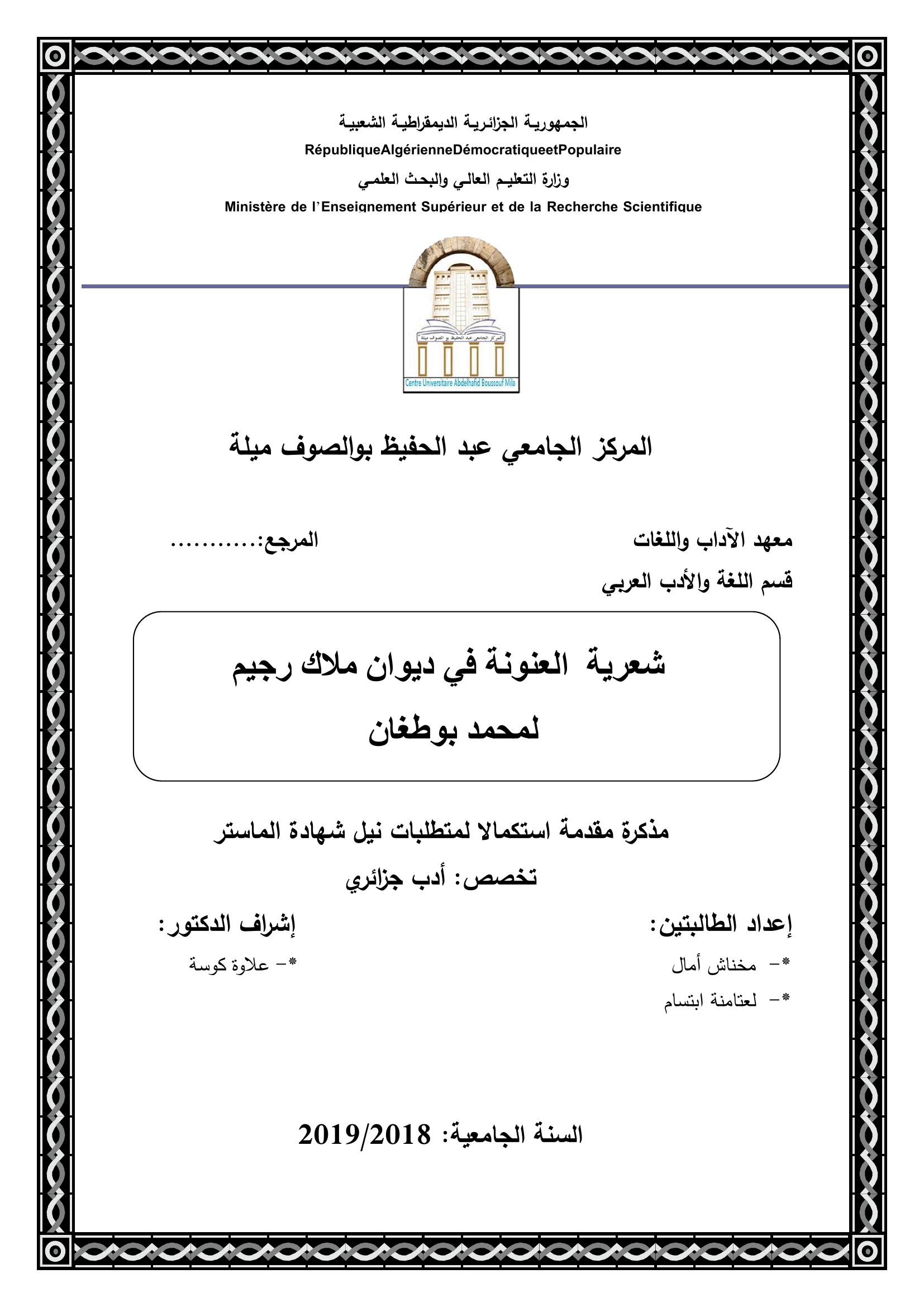 مخناش أمال & كوسة علاوة (مشرفا) (2019). شعرية العنونة في ديوان ملاك رجيم لمحمد بوطغان.