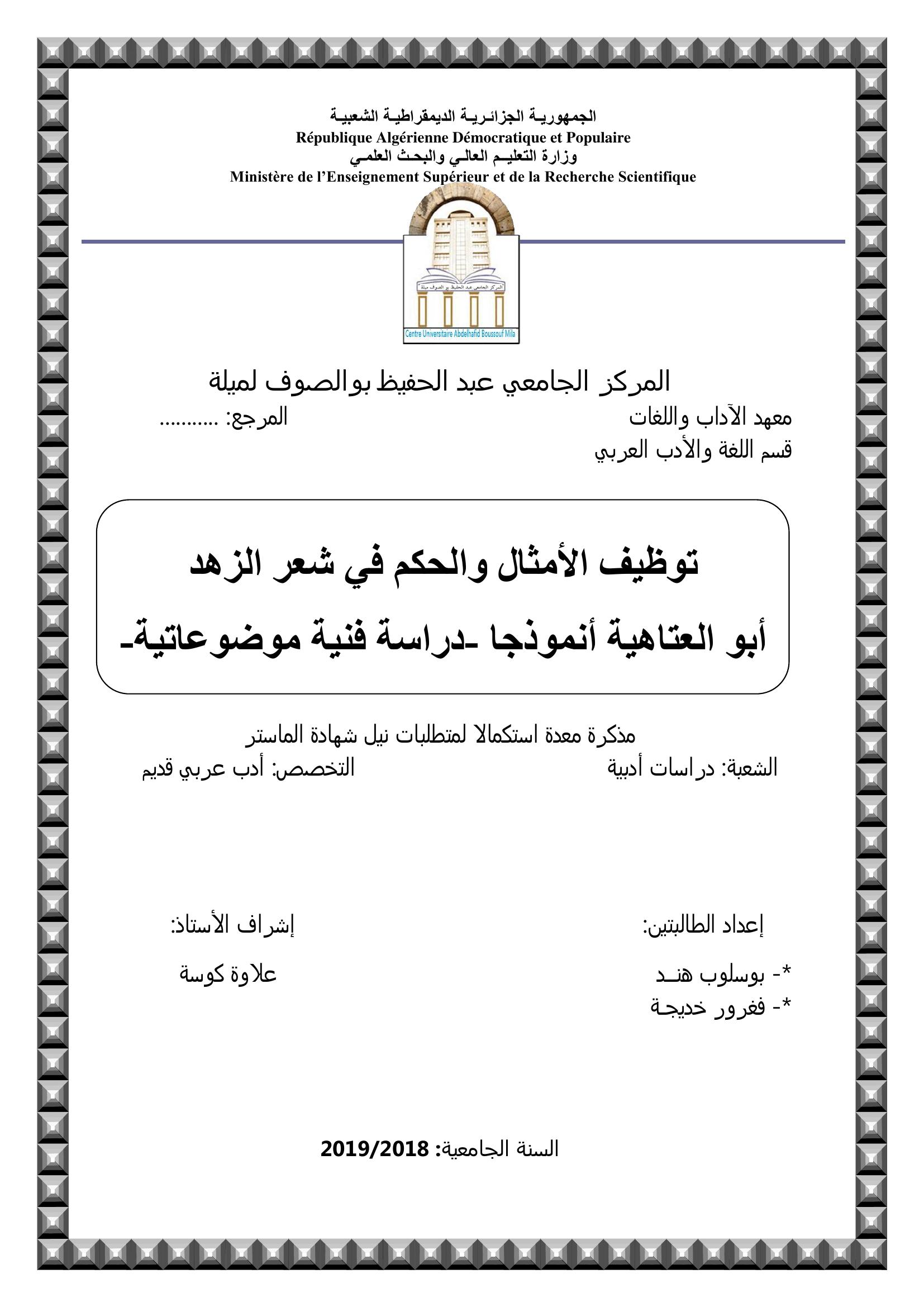 بوسلوب هند & كوسة علاوة (مشرفا) (2019). توظيف الامثال والحكم في شعر الزهد أبو العتاهية انمودجا - دراسة فنية موضوعاتية -.