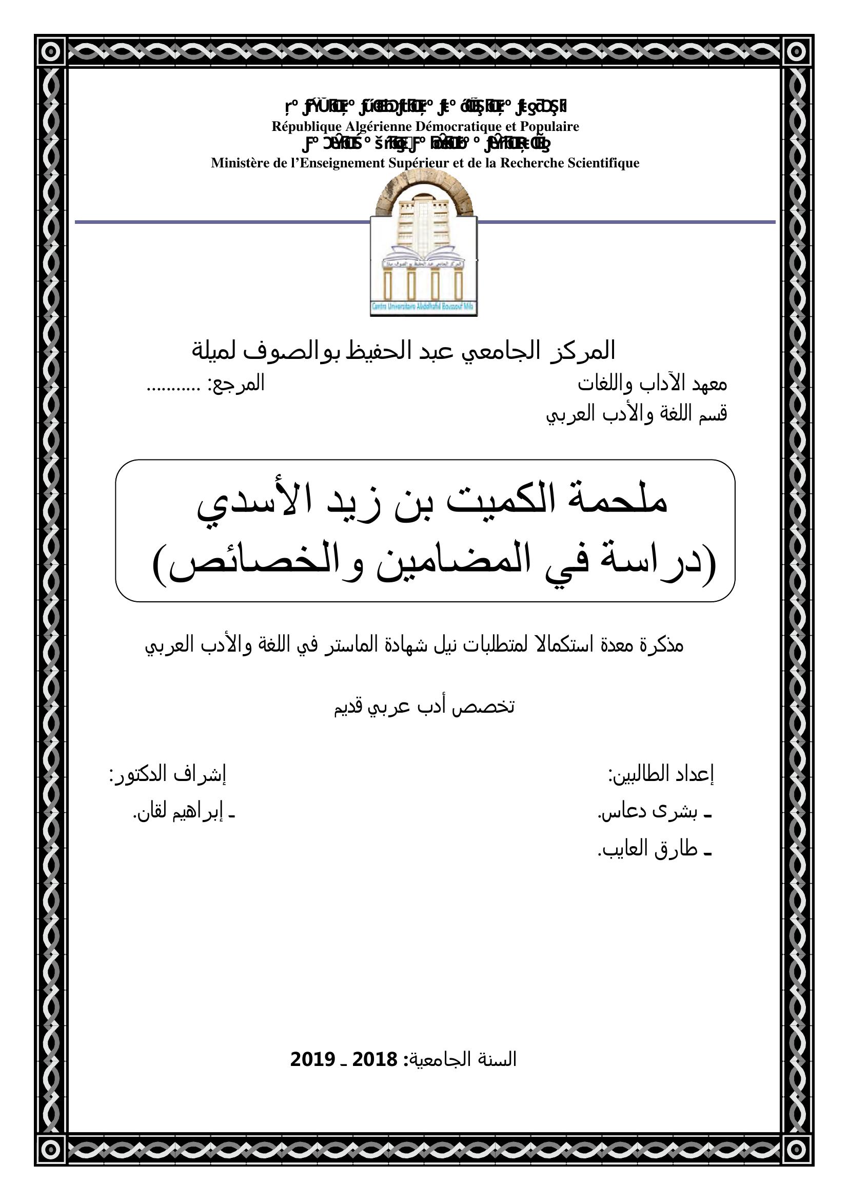 دعاس بشرى & لقان ابراهيم (مشرفا) (2019). ملحمة الكميت بن زيد الاسدي - دراسة في المضامين والخصائص -.