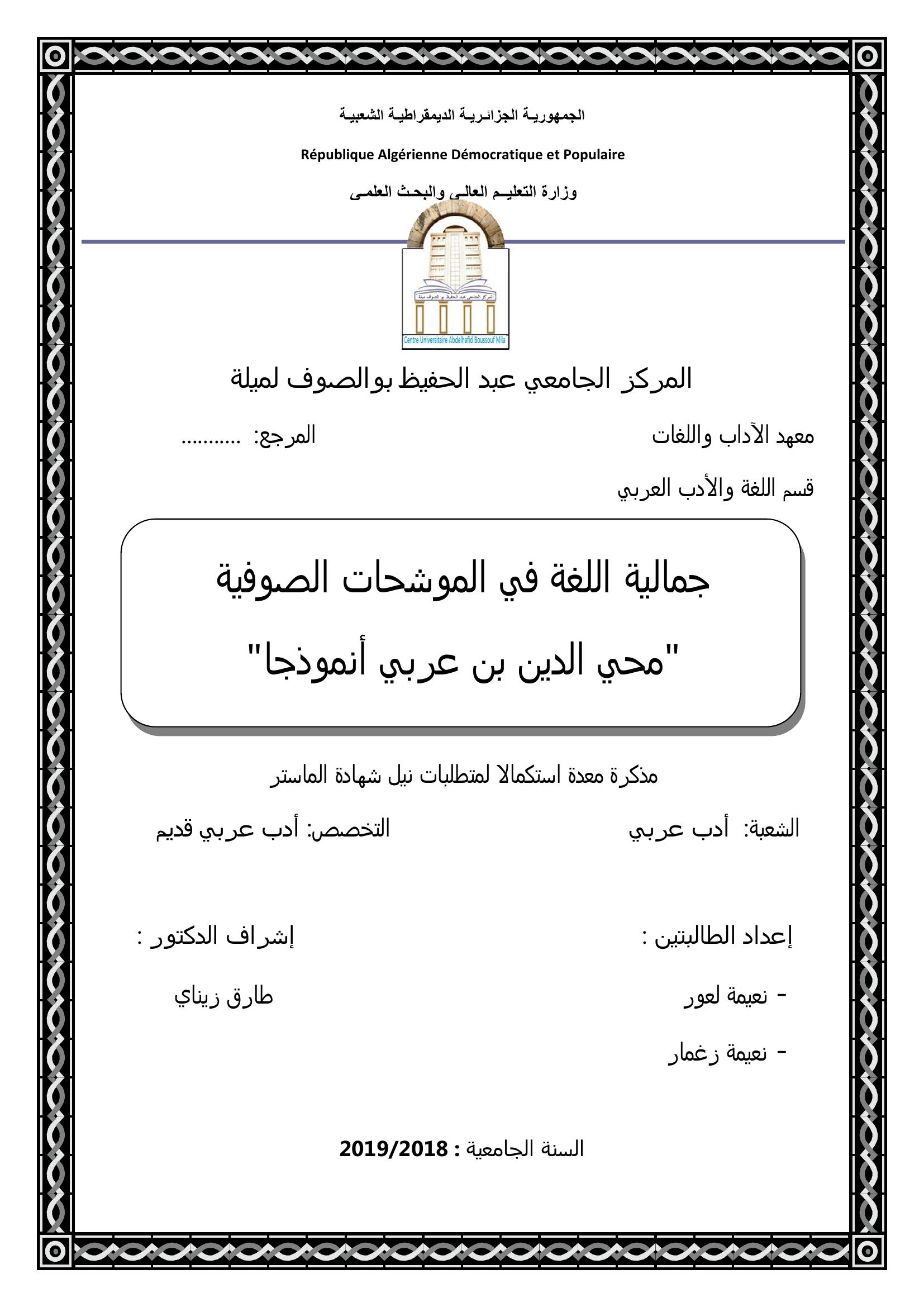 لعور نعيمة & زيناي طارق(مشرفا) (2019). جمالية اللغة للموشحات الصوفية " محي الدين بن عربي "انمودجا.