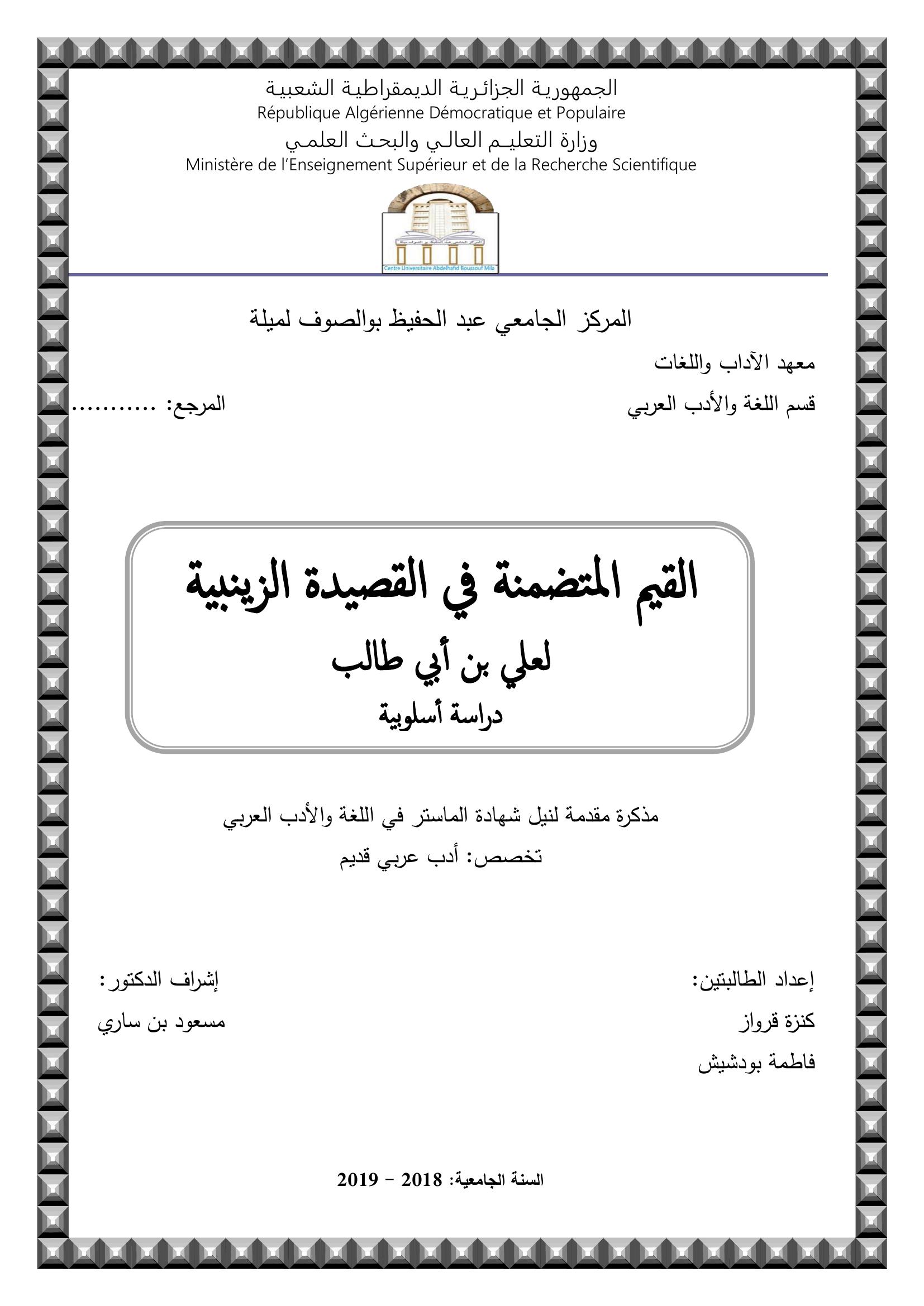 قرواز كنزة & بن ساري مسعود(مشرفا) (2019). القيم المتضمنة في القصيدة الزينبية لعلي بن أبي طالب دراسة أسلوبية.