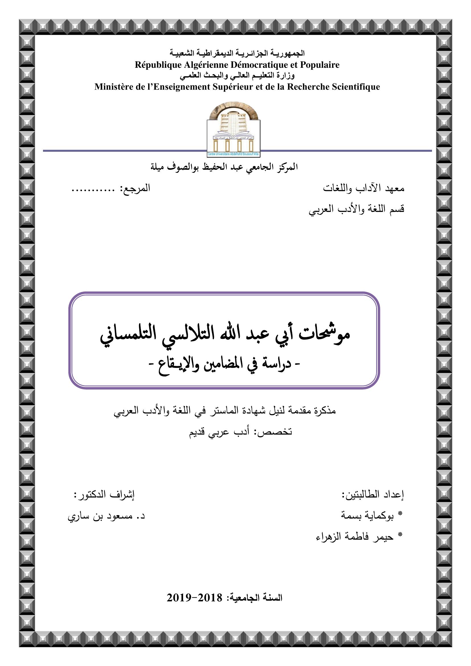 بوكماية بسمة & بن ساري مسعود(مشرفا) (2019). موشحات أبي عبد الله التلمساني"دراسة في المضامين والإيقاع".