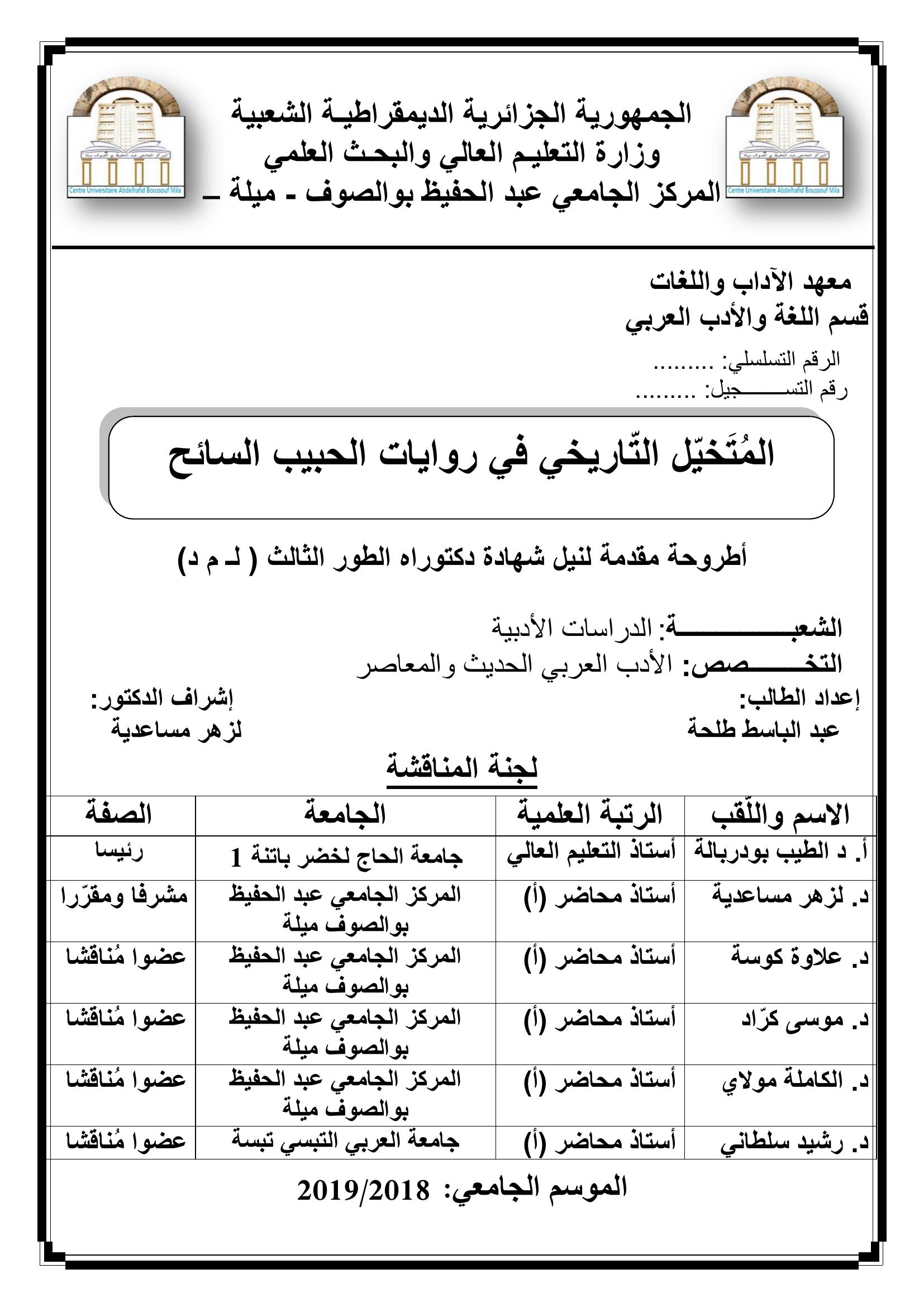 This research stems from the hypothesis of revealing the manifestations of history in some examples of novels chosen from ELHabib El Sayh’s novels. This is to stop at the problematic issue of the “historical visualizer” as it is a new term used in the modern critique studies. This research also tried to look for an answer to the difference between the historical visualiser and the historical novel as well as the differentiating line between the two. Under this research, we find the first chapter which involves a group of unites discussing the questions the historical visualiser asks in his novels especially his role in discovering the relationship between history and ideology. Also, the way in which identity falls under the control of history as it is the biggest component present in constituting it. The idea of the historical visuliser appears in EL Habib El Sayah’s novels to reveal many facts: In the second chapter, and through the analysis of some facts about the cores of ideology, the failure of communism, the causes of the death of Marxism and the torture to the group members, and the nature of the conflict between history and religion during the crisis are demonstrated. Then, the role of deconstructing the historical chain and presenting the imaginative history is done. This all is in a group of novels. Since identity is strongly linked to history, the third chapter illustrated the role of a group of big historical incidents in modifying its path and making it live different status of perturbation. The relationship appeared disconnected between two generations: the time of the democratic change that Algeria witnessed and appeared alien in the time of crisis witnessed also by the country. It also appeared contradicting itself and disconnected because of violence. Finally, the historical visualiser represented identity as dedicated to the national history especially the history of liberation. This shows that the history with its pros and cons remained an important reference to build identity.