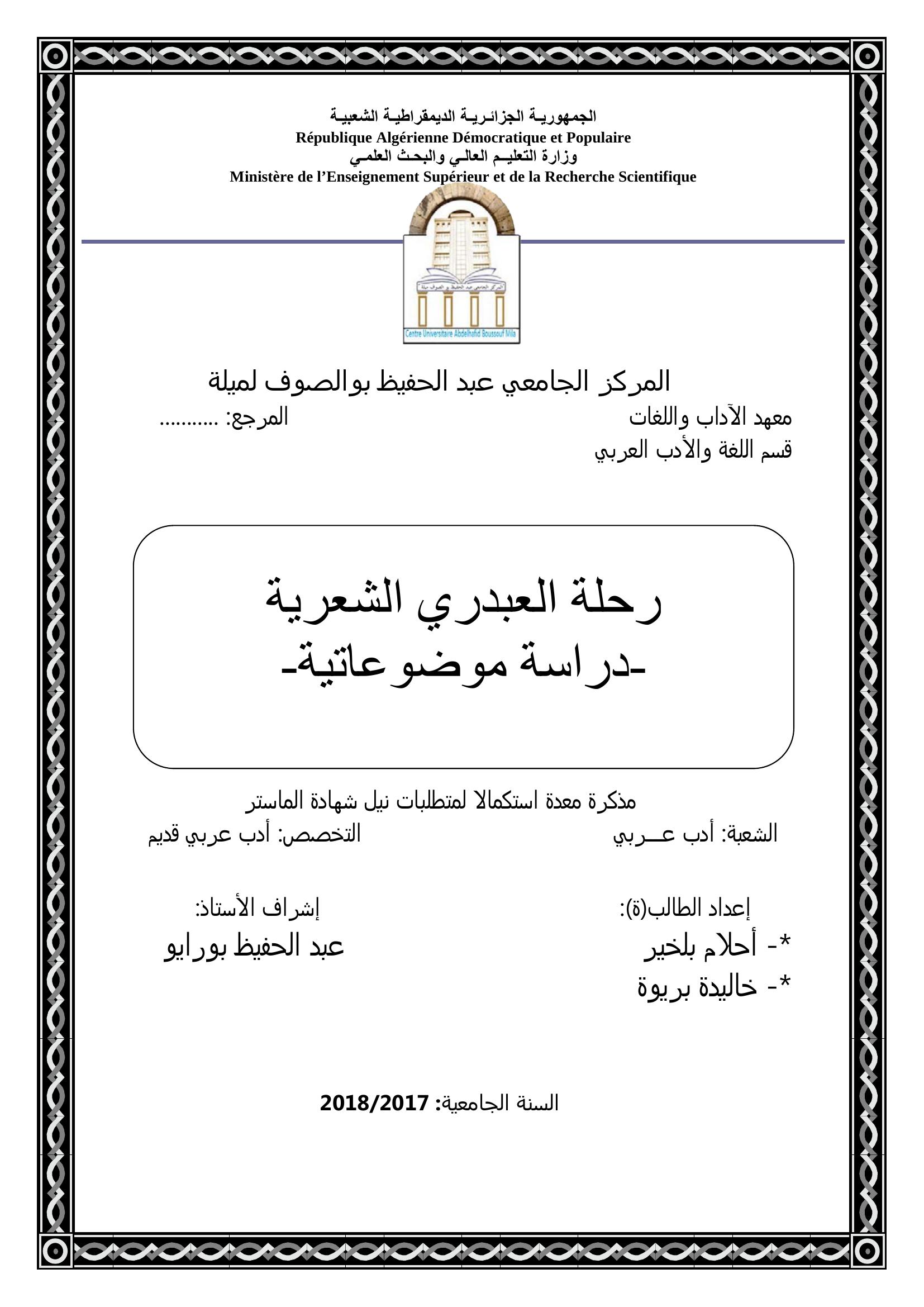بلخير أحلام et al. (2018). رحلة العبدري الشعرية - دراسة موضوعاتية.
