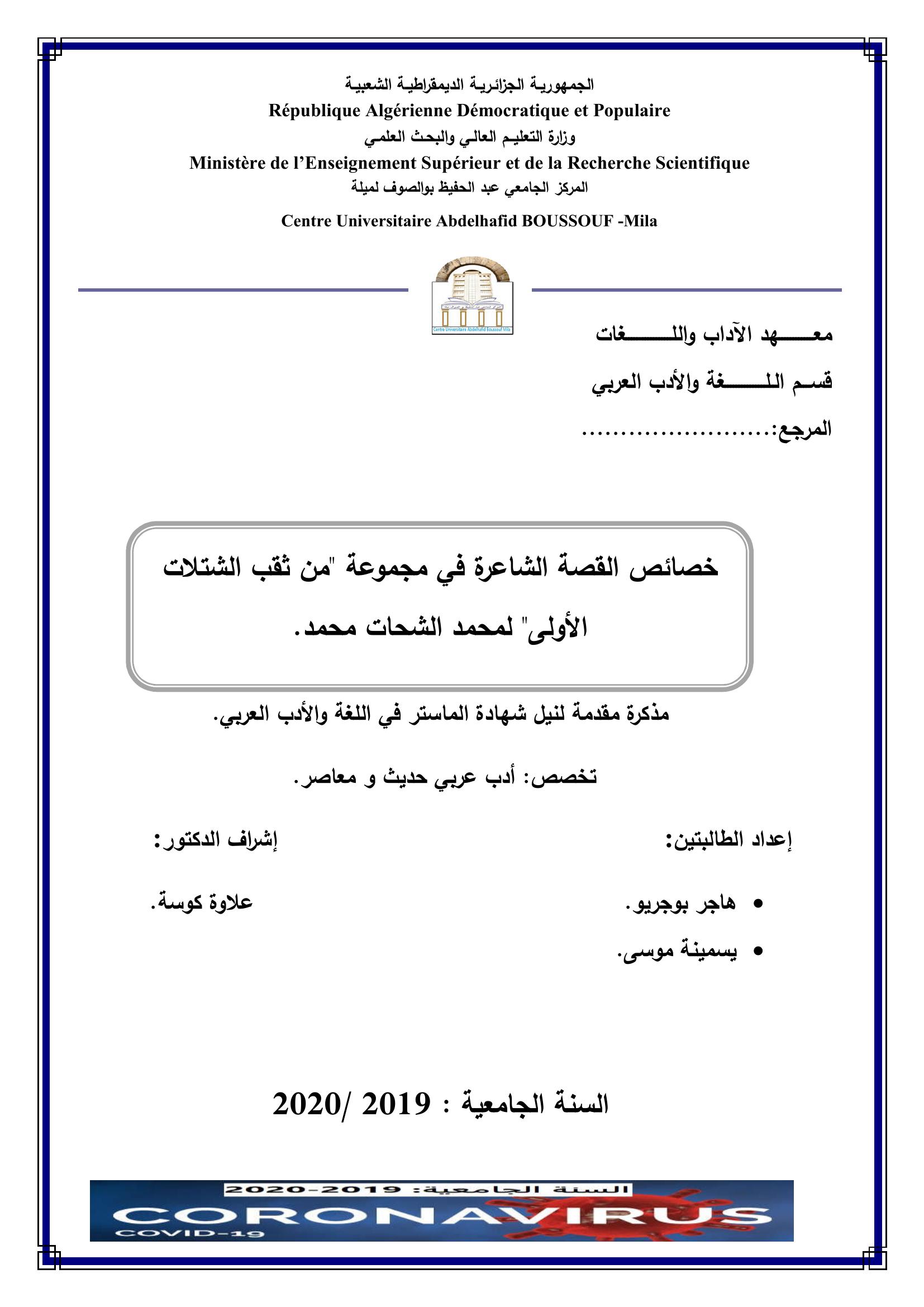 بوجريو هاجر et al. (2020). خصائص القصة الشاعرة في مجموعة "من ثقب الشتلات الأولى" لمحمد الشحات محمد.