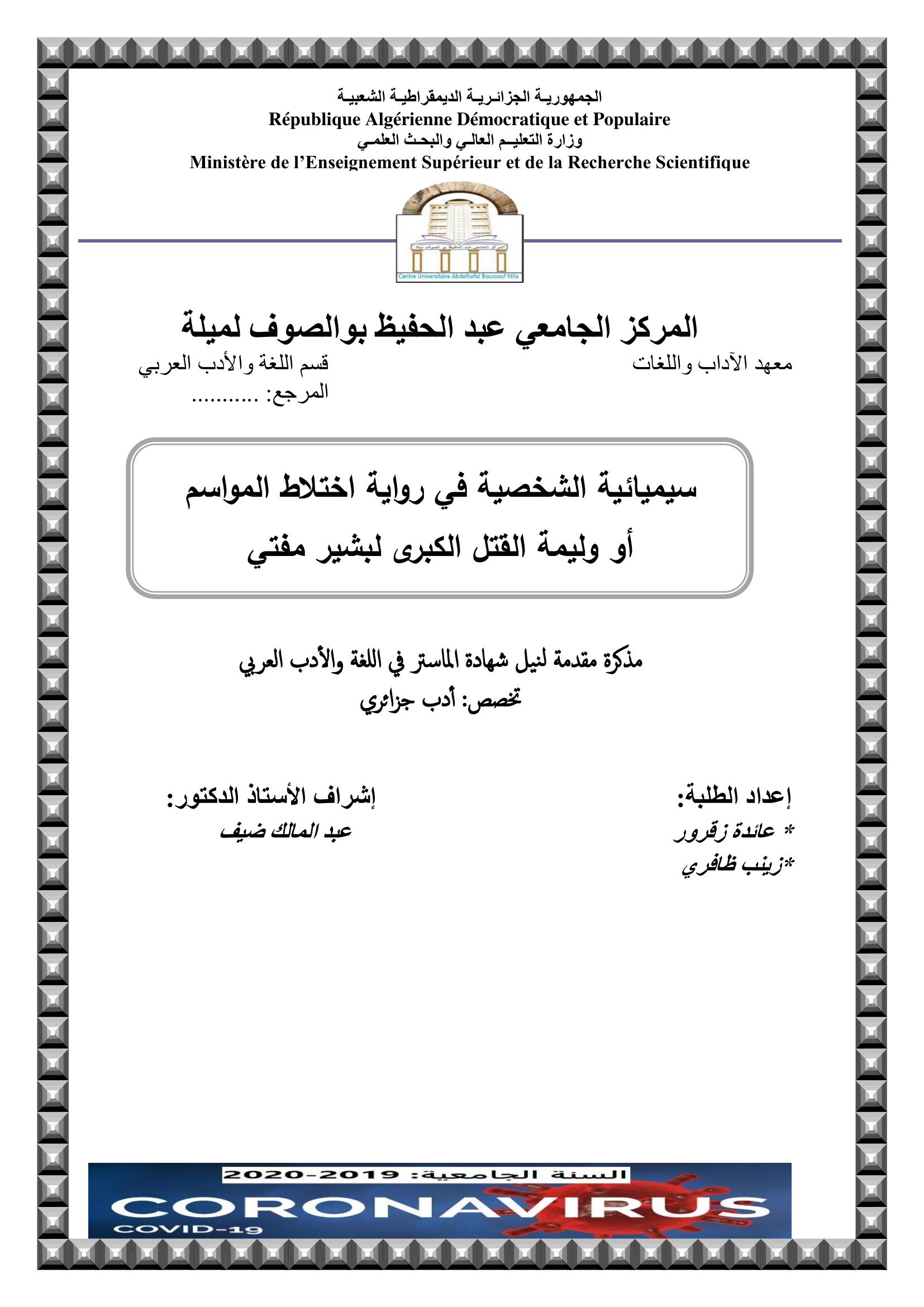 زقرور عائدة et al. (2020). سيميائية الشخصية في رواية اختلاط المواسم أو وليمة القتل الكبرى - لبشير مفتي-.