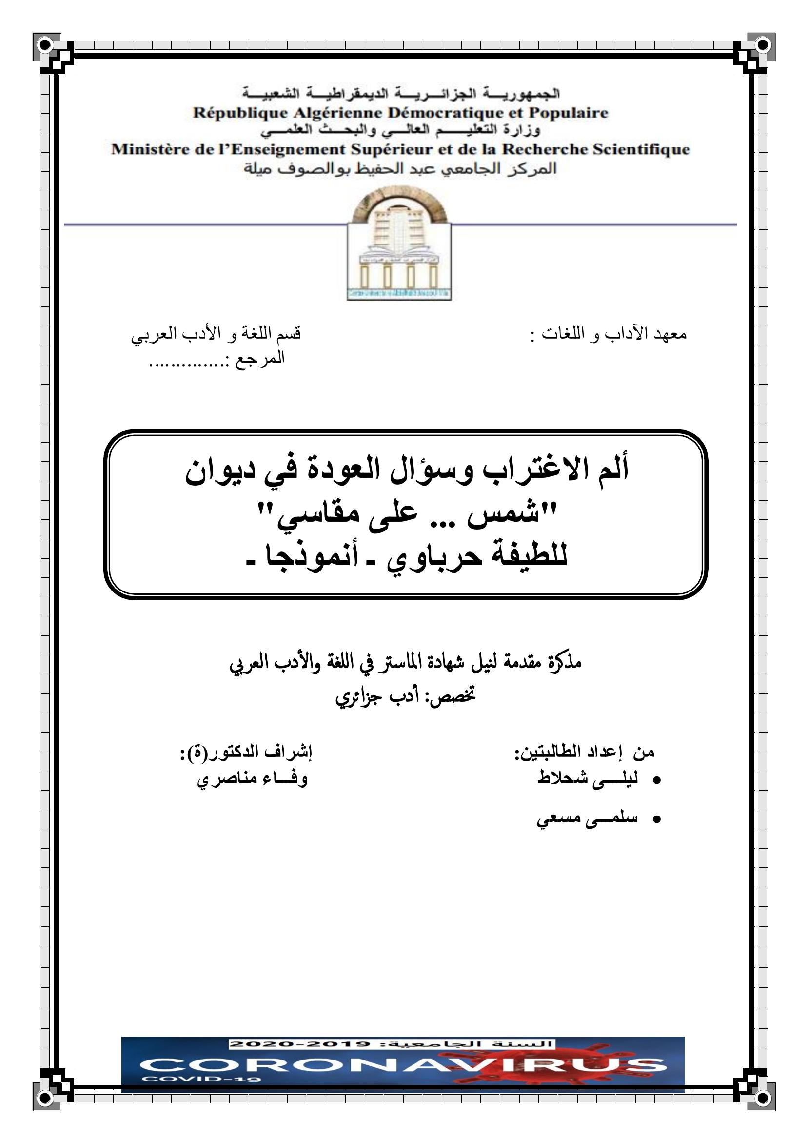 مسعي سلمى et al. (2020). ألم الإغتراب وسؤل العودة في ديوان " شمس على مقاسي" للطيفة حرباوي.