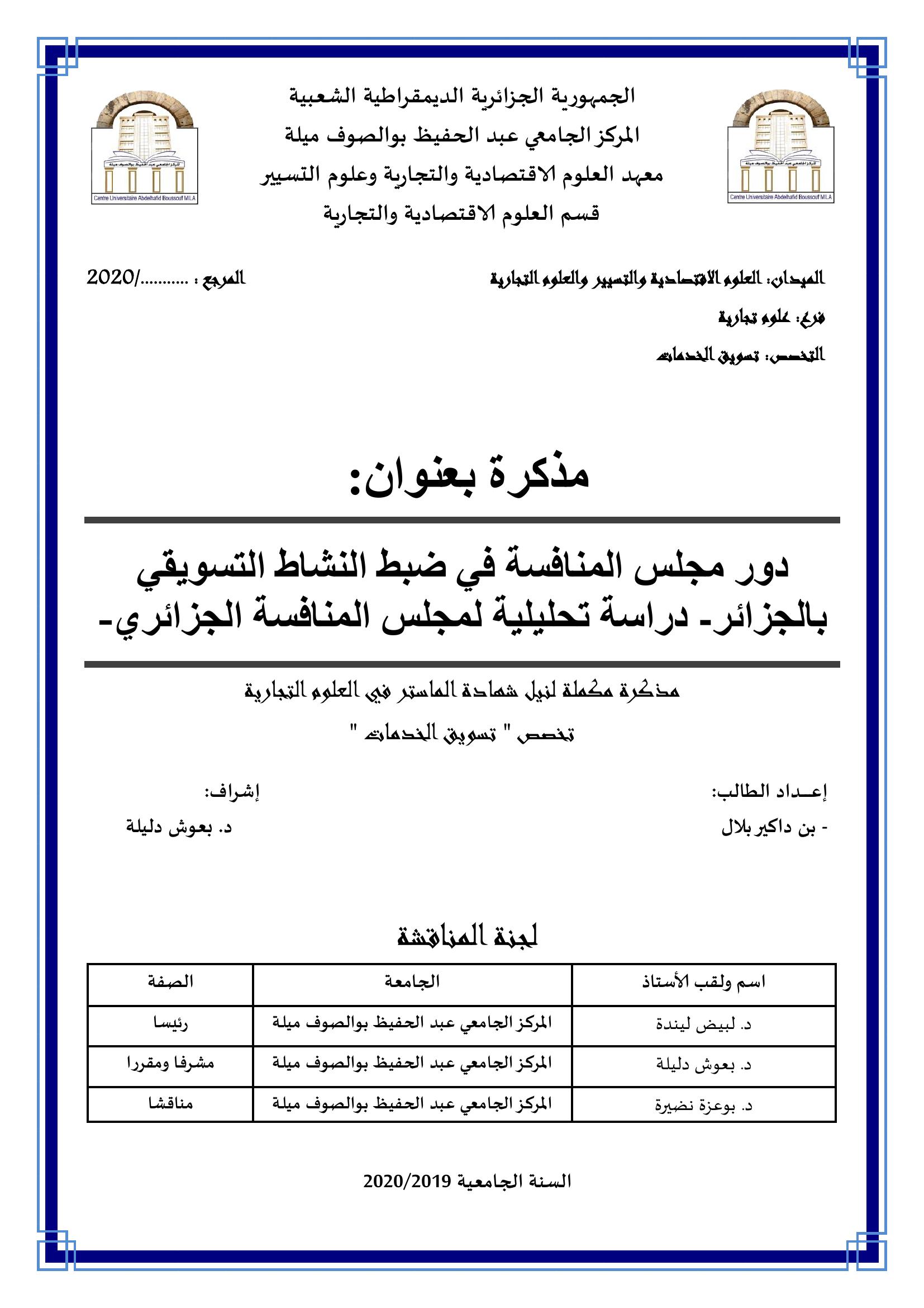 بن داكير بلال & لبيض ليندة(رئيسا)،بعوش دليلة(مشرفا ومقررا)،بوعزة نضيرة(مناقشا) (2020). دور مجلس المنافسة في ضبط النشاط التسويقي في الجزائر.