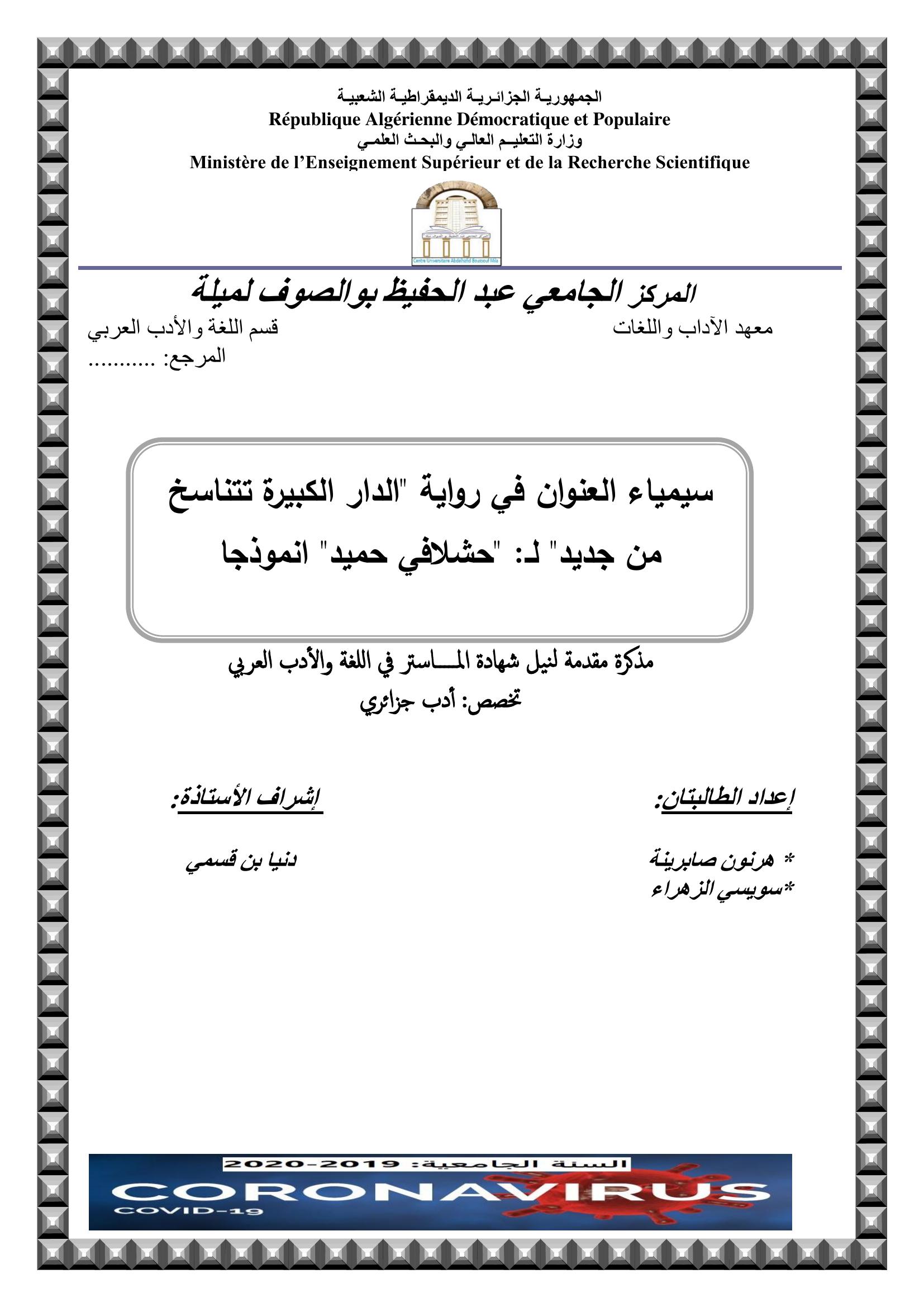 هرنون صابرينة et al. (2020). سيميائية العنوان في رواية " الدار الكبيرة تتناسخ من جديد" لحشلافي حميد.