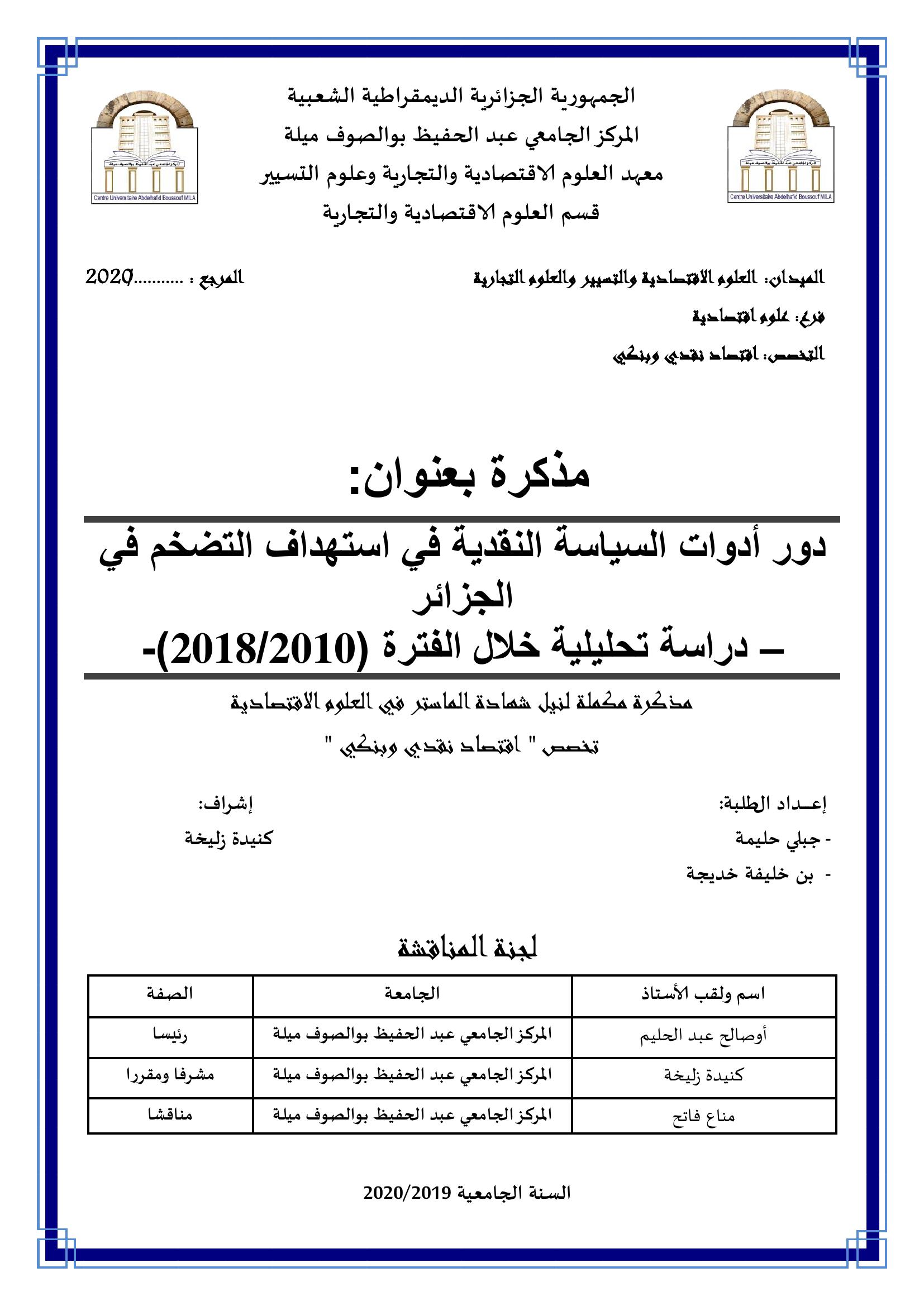 جبلي حليمة et al. (2020). دور أدوات السياسة النقدية في استهداف التضخم في الجزائر دراسة تحليلية خلال الفترة 2018/2010.