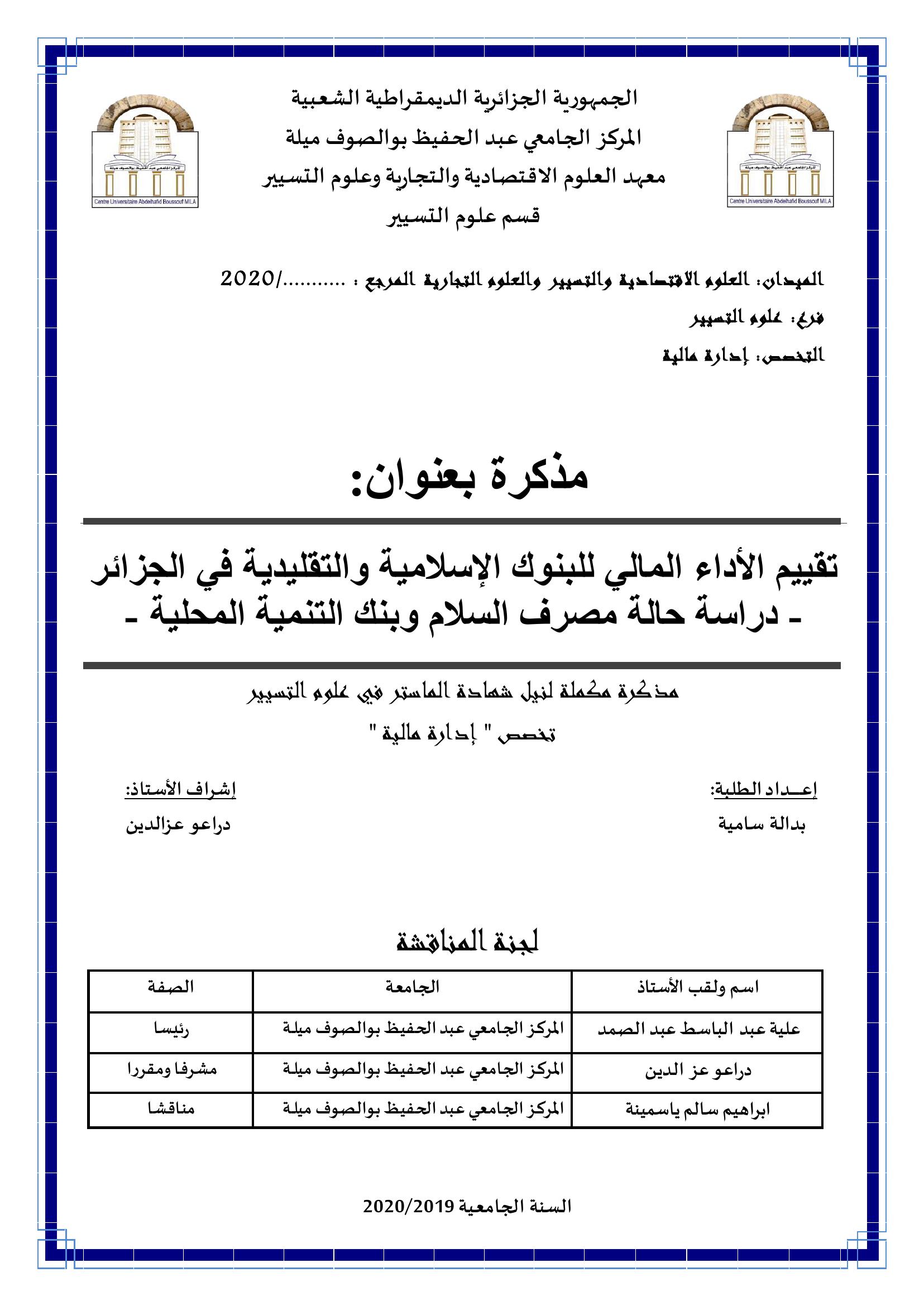 بدالة سامية & دراعو عز الدين (مشرفا) (2020). تقييم الأداء المالي للبنوك الإسلامية والتقليدية في الجزائر.