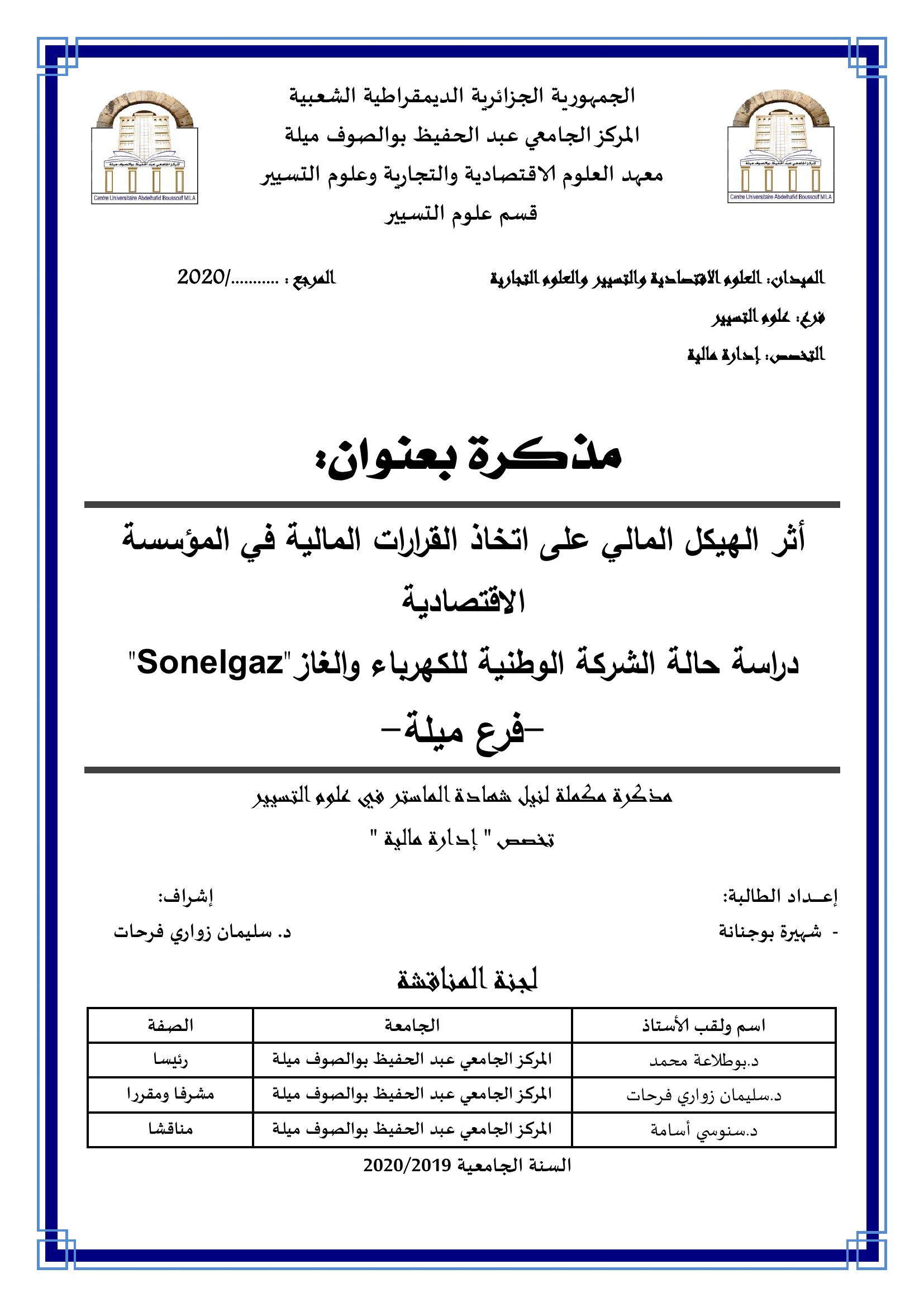 بوجنانة شهيرة & سليمان زواري فرحات (مشرفا) (2020). أثر الهيكل المالي عمى اتخاذ القرارات المالية في المؤسسة الاقتصادية.