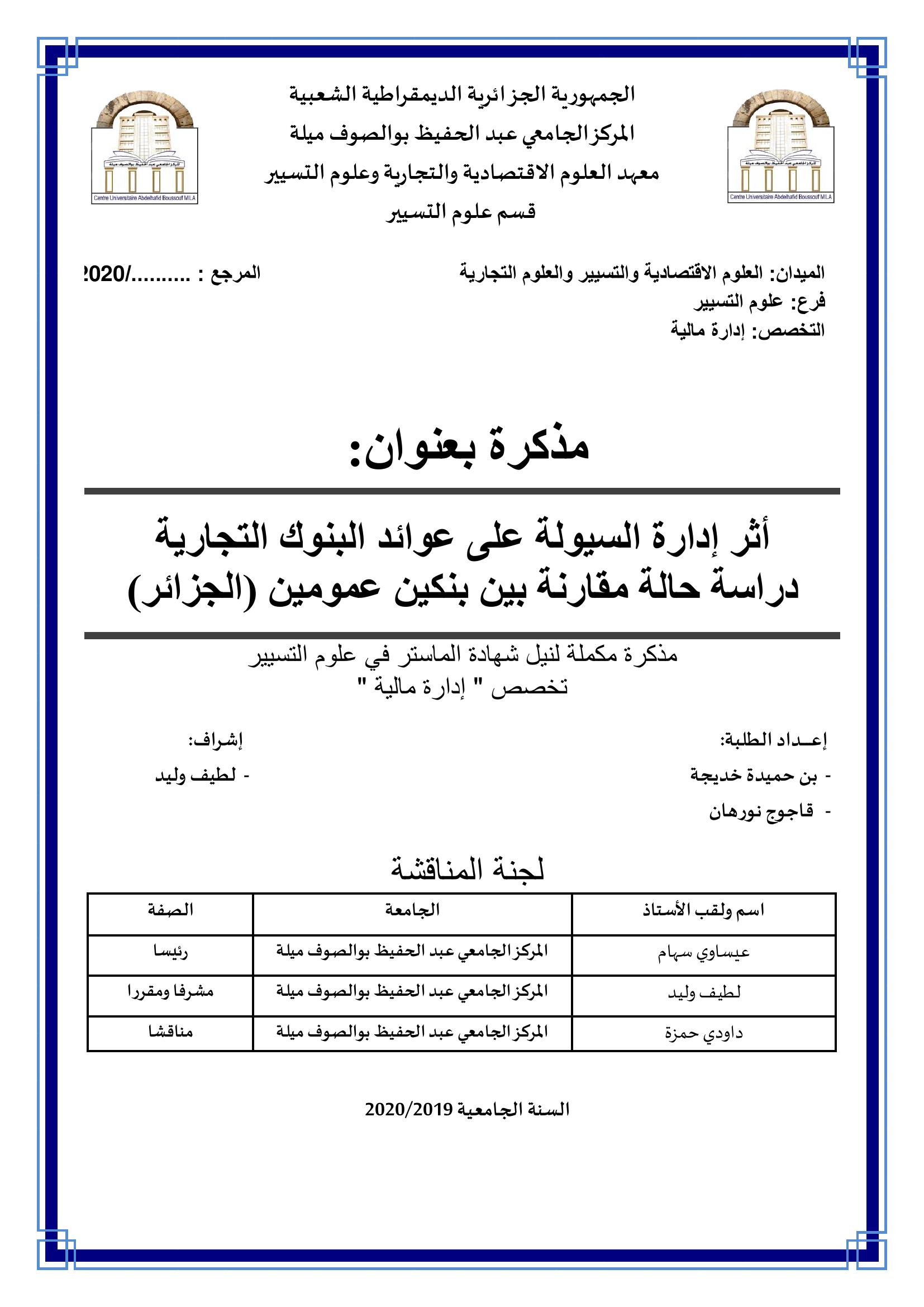 قاجوج نورهان et al. (2020). أثر إدارة السيولة على عوائد البنوك التجارية.
