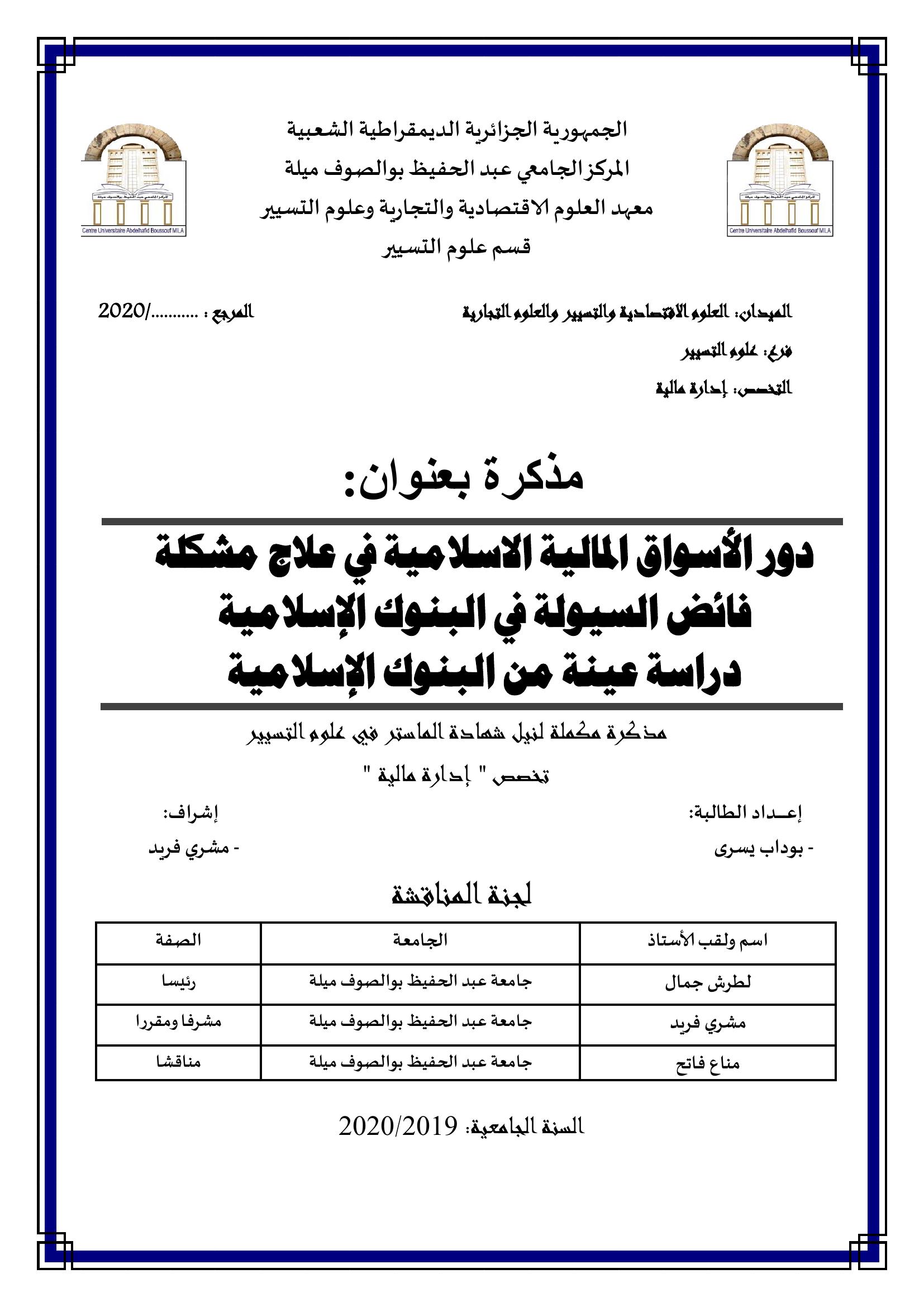 بوداب يسرى & مشري فريد(مشرفا) (2020). دور الأسواق المالية الاسلامية في علاج مشكلة فائض السيولة في البنوك الإسلامية.