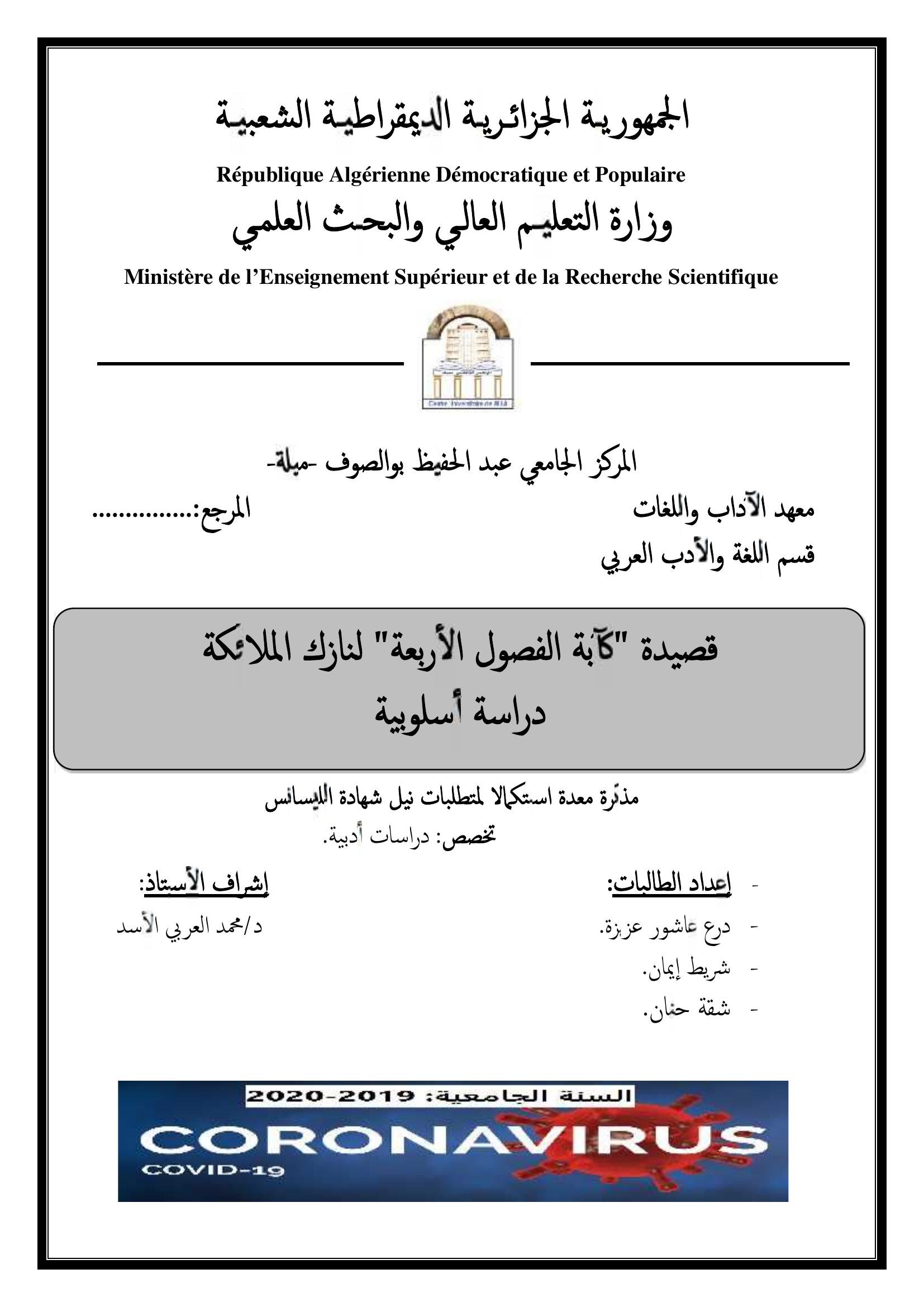 درع عاشور عزيزة et al. (2020). قصيدة "كآبة الفصول الأربعة "لنازك الملائكة دراسة أسلوبية.