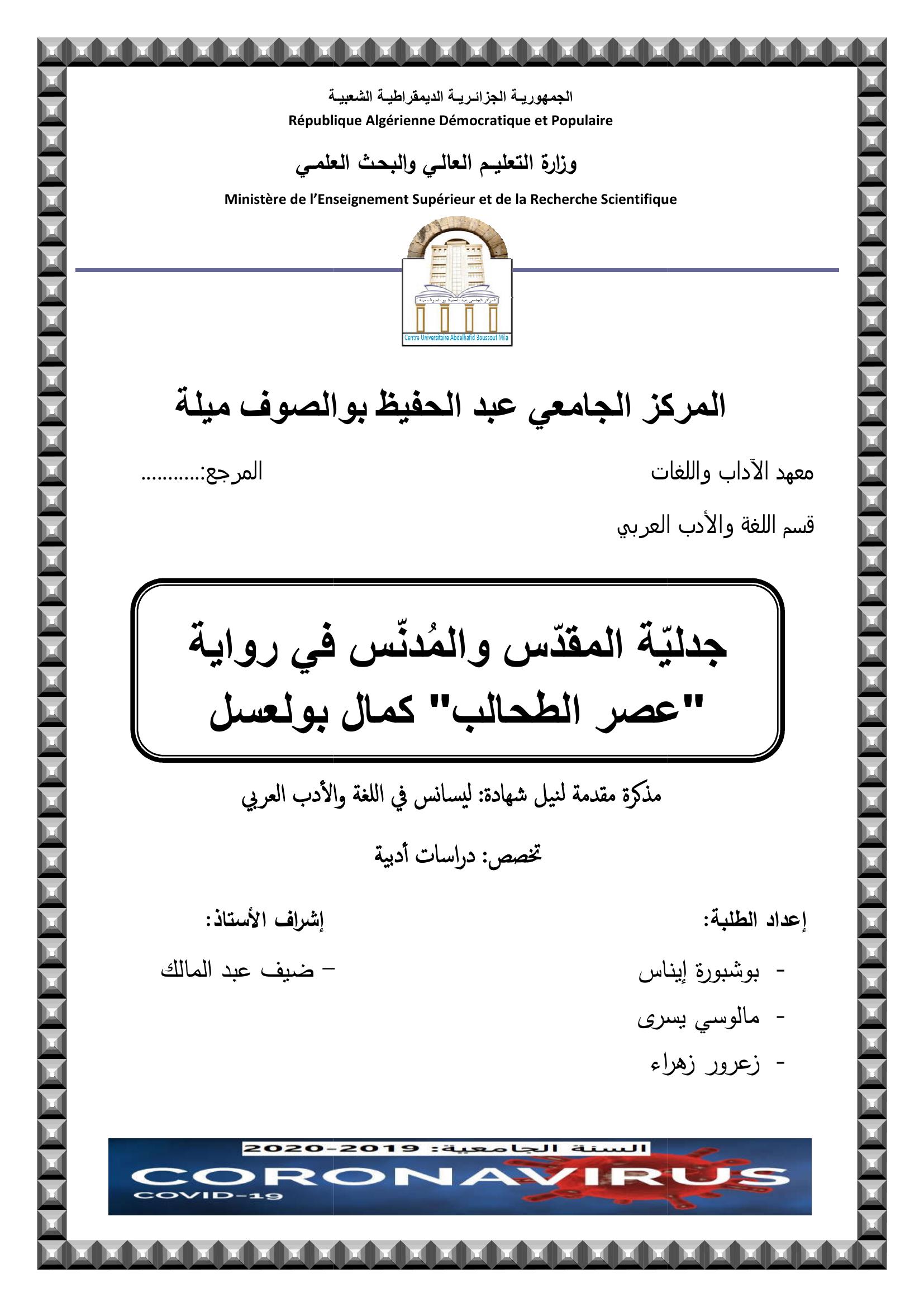 بوشبورة إيناس et al. (2020). جدلية المقدس و المدنس في رواية "عصر الطحالب" كمال بولعسل.