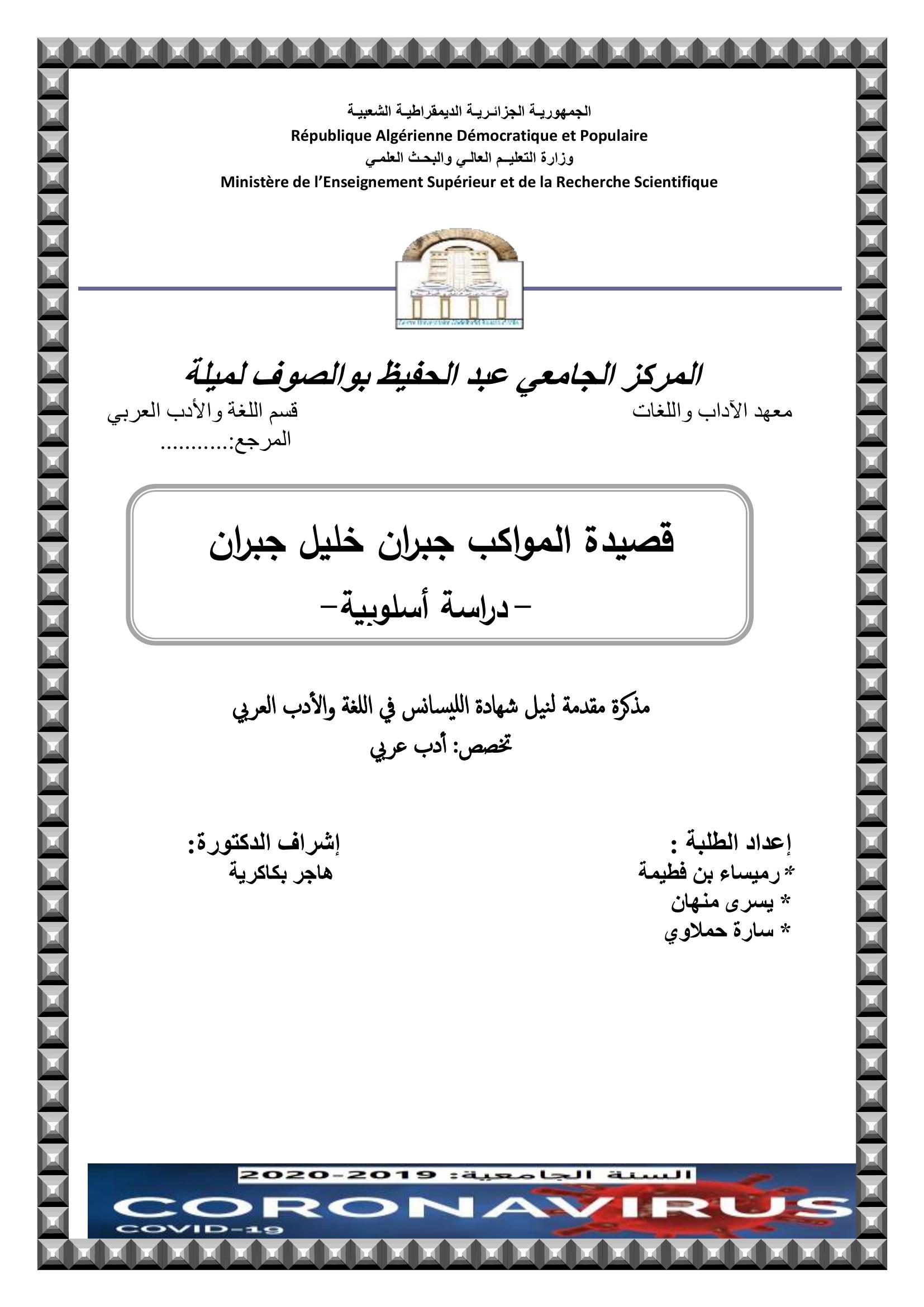 بن فطيمة رميساء et al. (2020). قصيدة المواكب جبران خليل جبران -دراسة أسلوبية-.