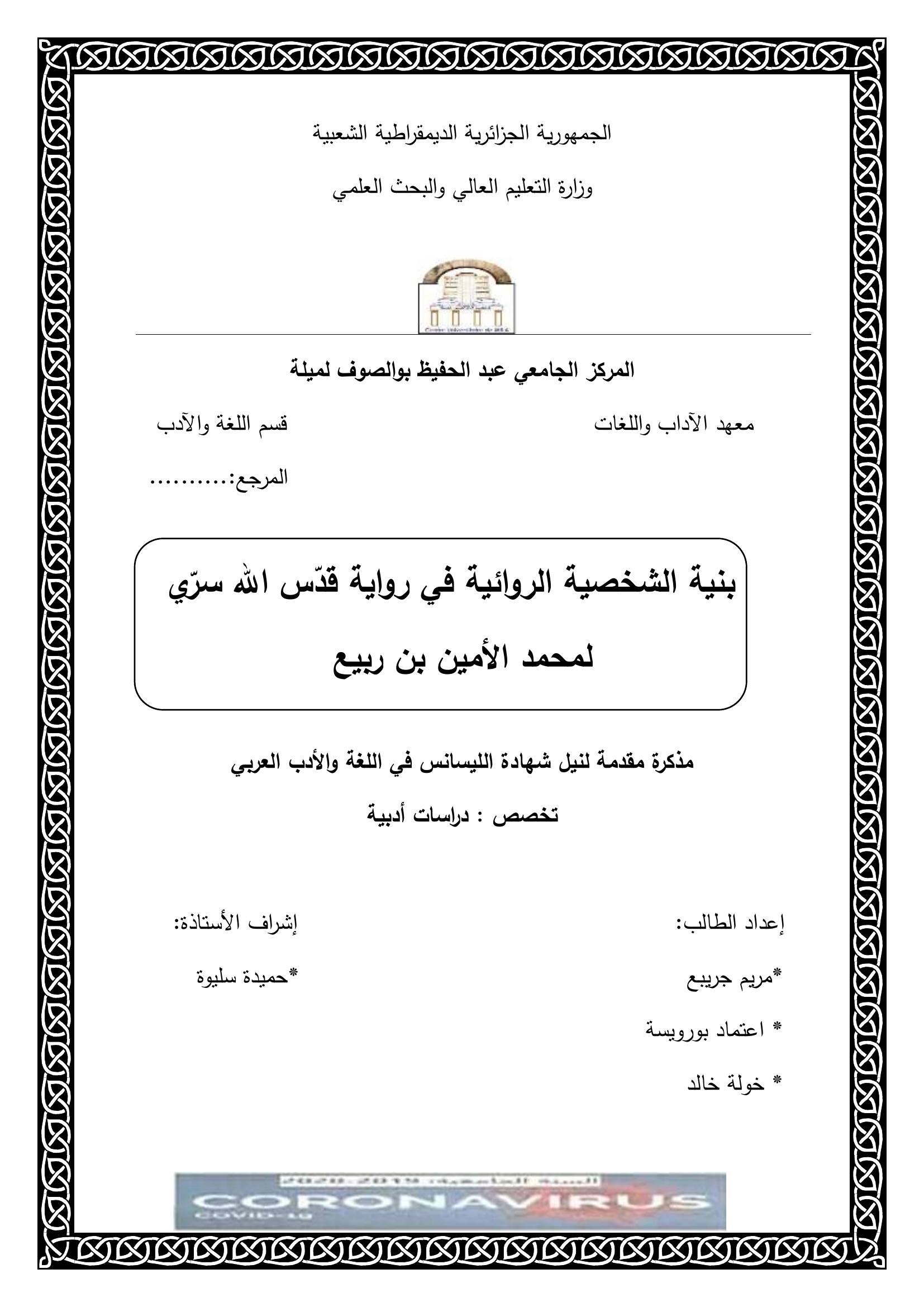 جريبع مريم et al. (2020). بنية الشخصية الروائية في رواية قدس الله سري لمحمد الأمين بن ربيع.