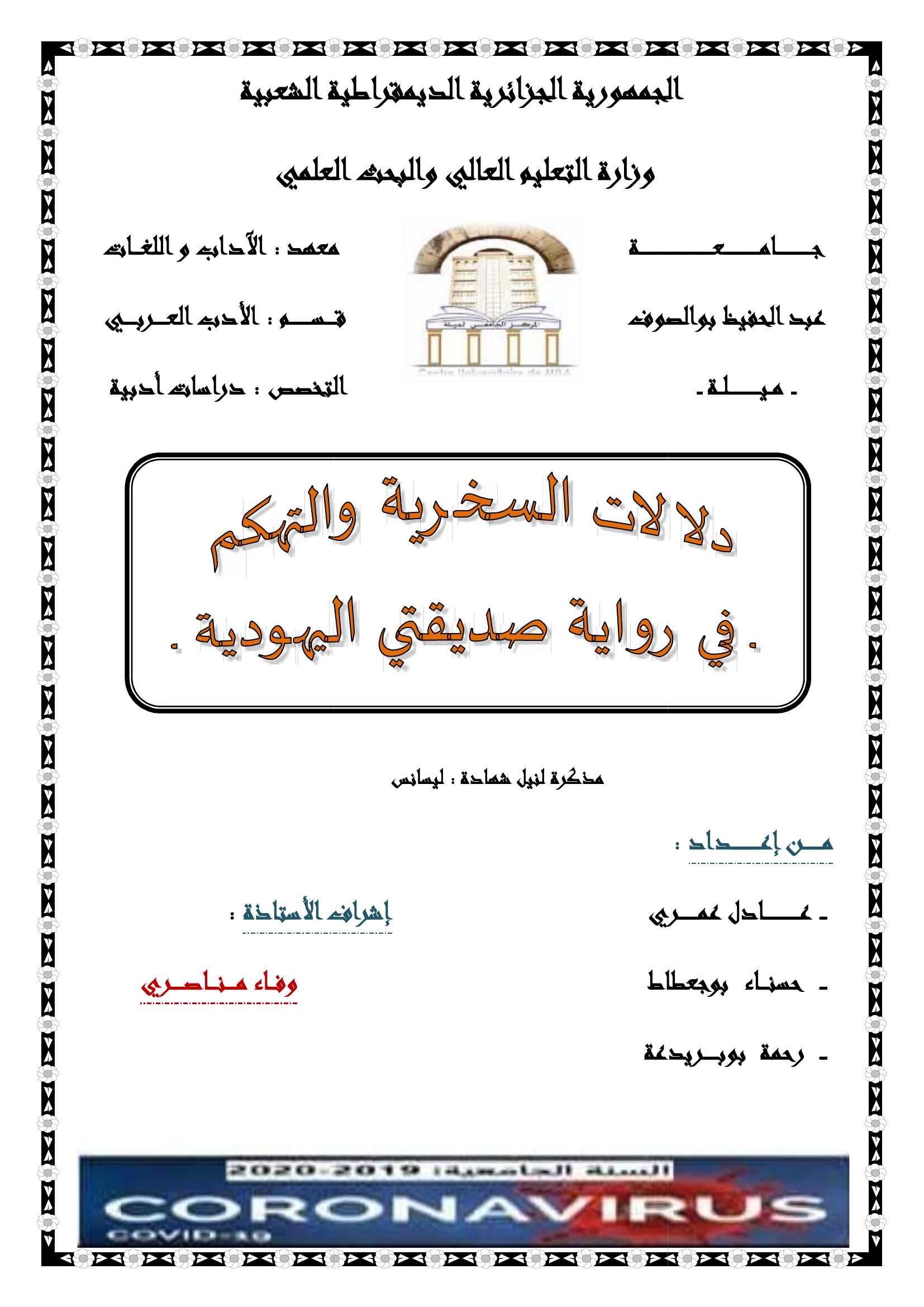 عمري عادل et al. (2020). دلالات السخرية و التهكم -في رواية صديقتي اليهودية -.