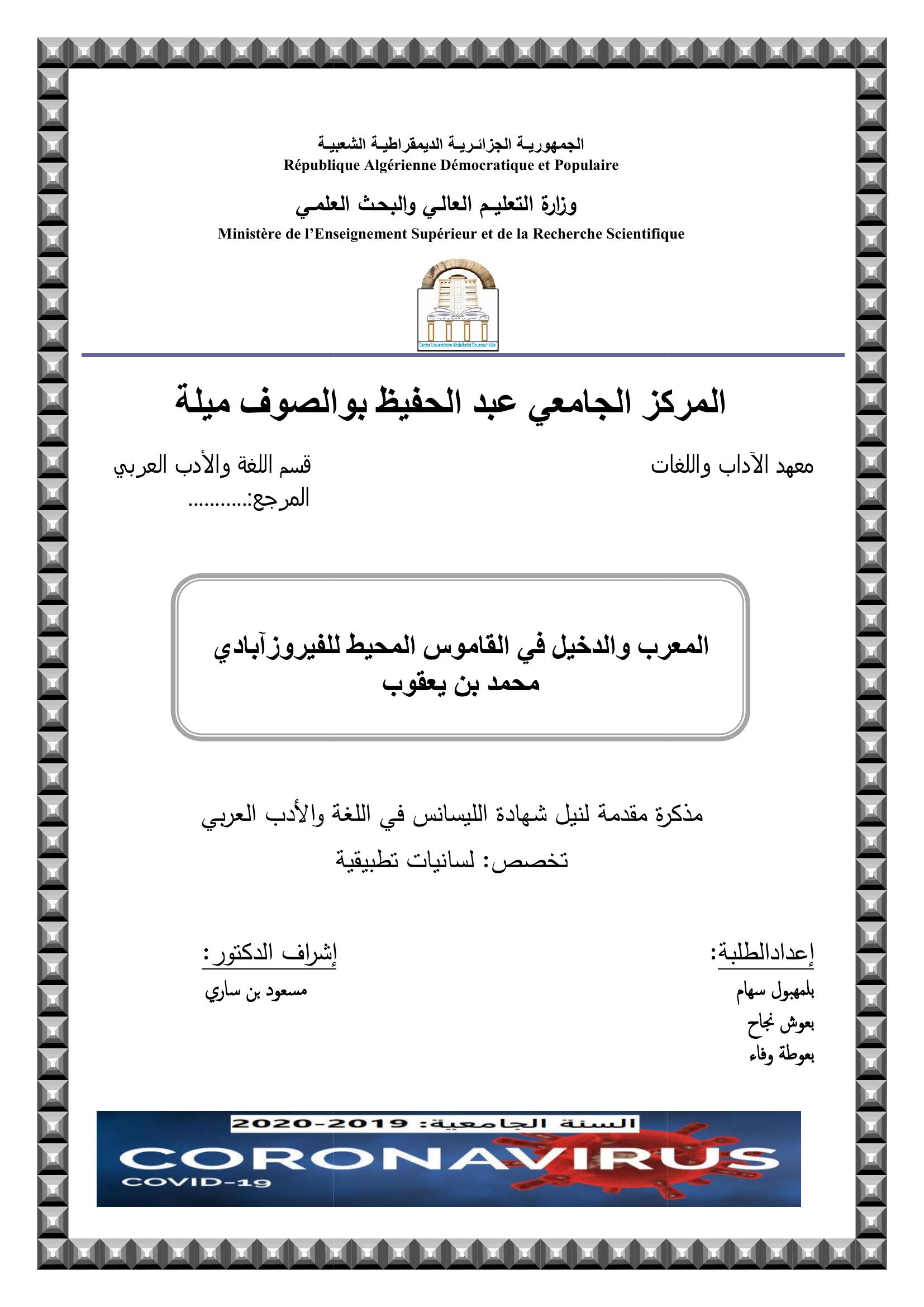 بلمهبول سهام et al. (2020). المعرب والدخيل في القاموس المحيط للفيروز ابادي محمد بن يعقوب.