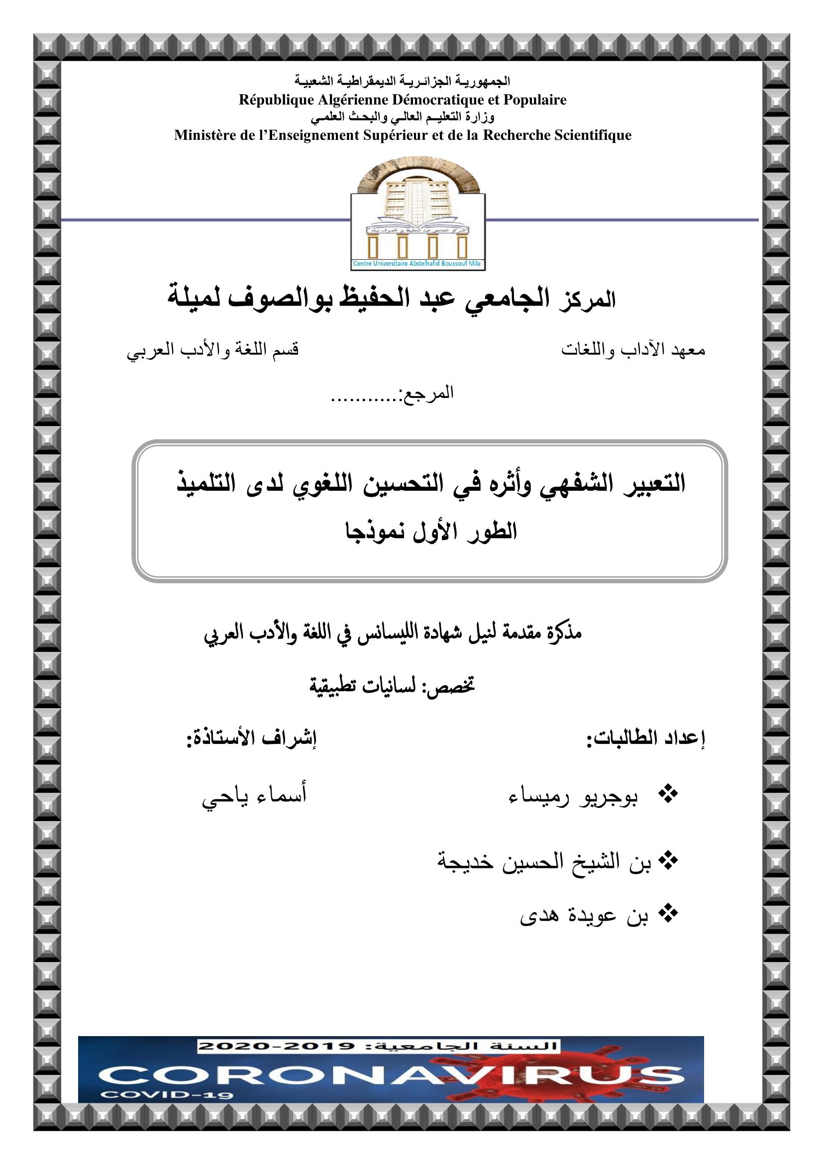 بن عويدة هدى et al. (2020). التعبير الشفهي وأثره في التحسين اللغوي عند التلميذ " الطور الأول نمودجا.