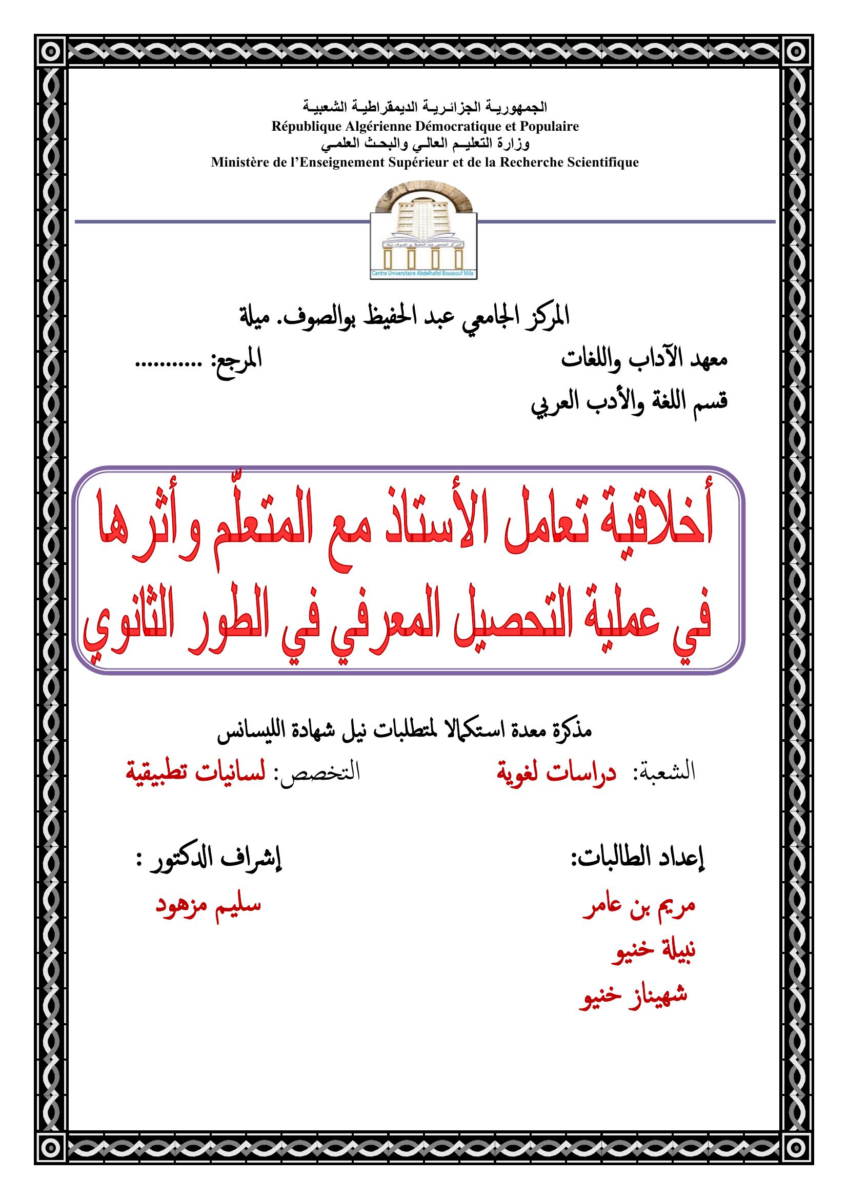 أخلاقية تعامل الأستاذ مع المتعلم و أثرها في عملية التحصيل المعرفي في الطور الثانوي