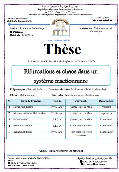 résumé Dans cette thèse, nous avons présenté quelques sujets de base qui sont nécessaires pour étudier la Bifurcations et le Chaos dans un système d'ordre fractionnaire. Notamment, les conditions de la stabilité et l'existence des solutions périodiques. Dans le but de faciliter l'étude de la stabilité nous avons consacré le premier travail pour prolonger les conditions de Routh-Hrwitz pour les systèmes fractionnaires d'ordre [ ) Dans le de le deuxième travail, nous étendons la modification qui consiste à fixer la longueur de la mémoire et à faire varier la borne inférieure des opérateurs de différentiation fractionnaire, cette modification nous a permis de conserver la périodicité. Pour illustrer nos résultats théoriques, nous avons utilisé quelques exemples numériques de certains systèmes d'ordre fractionnaire.