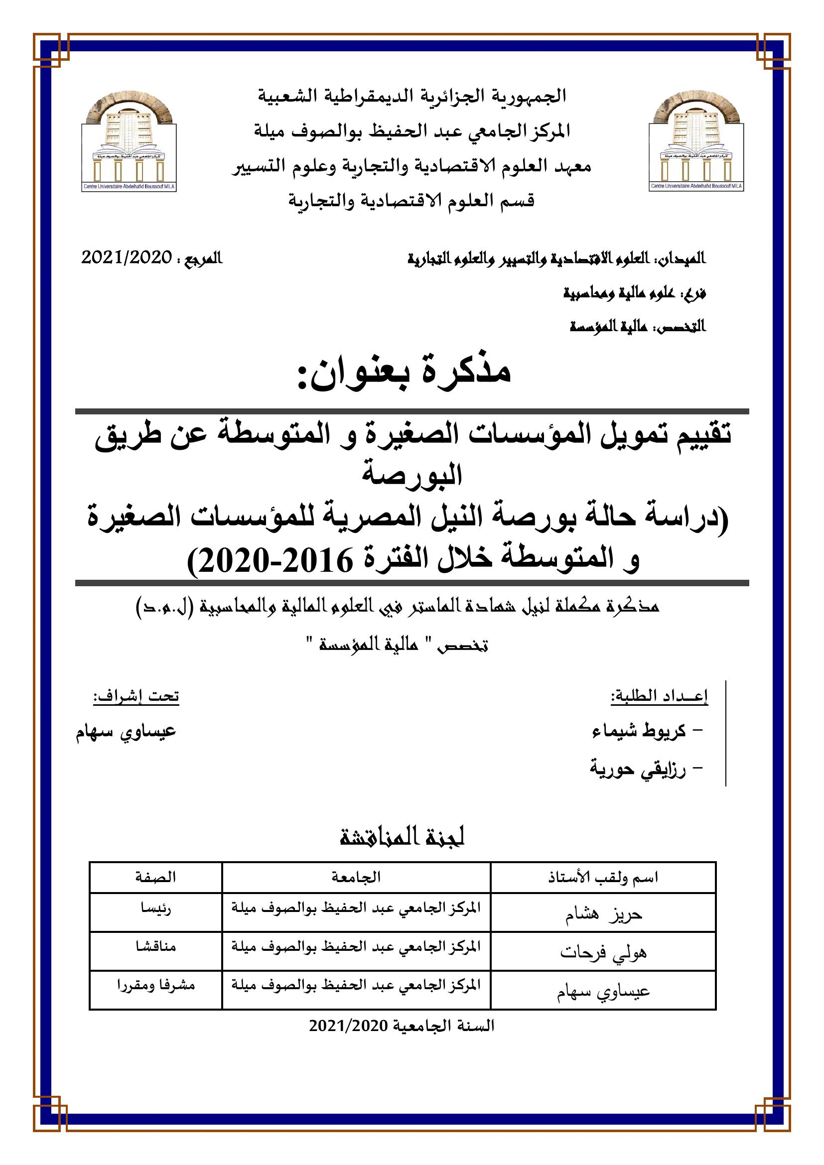 تقييم تمويل المؤسسات الصغيرة و المتوسطة عن طريق البورصة(دراسة حالة بورصة النيل المصرية للمؤسسات الصغيرة و المتوسطة خلال الفترة2016-2020