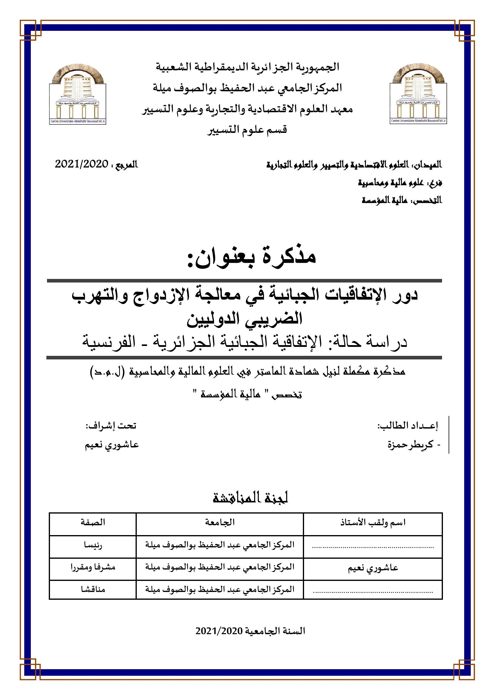 كريطر حمزة & عاشوري نعيم (مشرفا) (2021). دور الإتفاقيات الجبائية في معالجة الإزدواج والتهرب الضريبي الدوليين دراسة حالة الإتفاقية الجبائية الجزائرية - الفرنسية (ماستر- ل م د) . المركز الجامعي عبد الحفيظ بوالصوف ميلة.