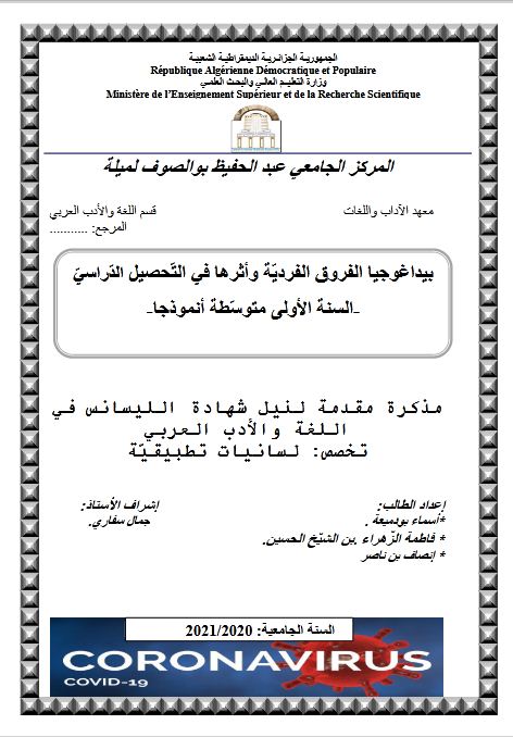 بودميعة أسماء et al. (2021). بيداغوجيا الفروق الفردية وأثرها في التحصيل الدراسي -السنة الأولى متوسط أنمودجا- (ليسانس- ل م د) . المركز الجامعي عبد الحفيظ بوالصوف ميلة.