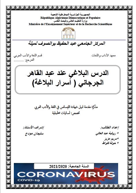 عزيز مريم et al. (2021). الدرس البلاغي عند عبد القادر الجرجاني (اسرار البلاغة) (ليسانس- ل م د) . المركز الجامعي عبد الحفيظ بوالصوف ميلة.