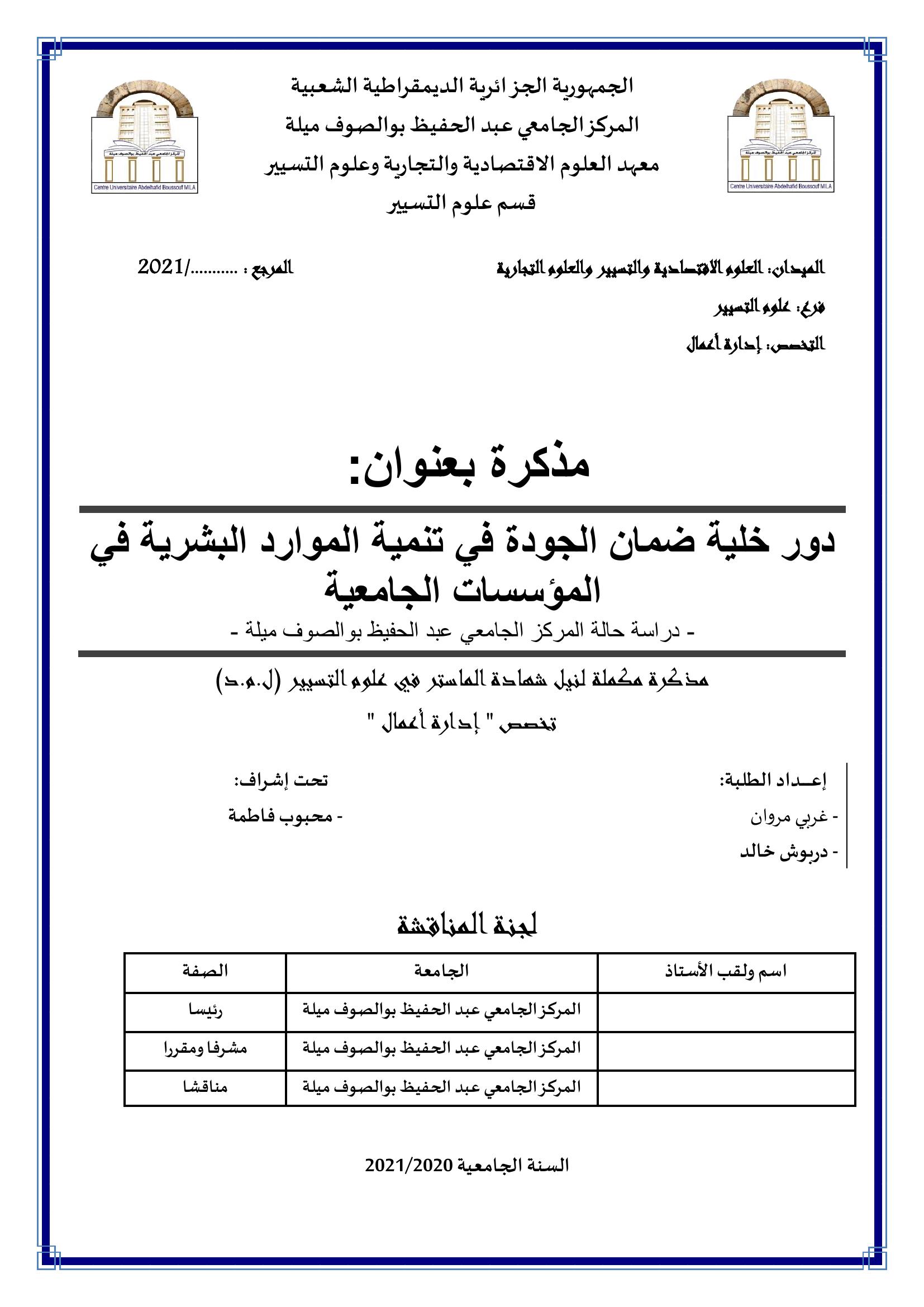 غربي مروان et al. (2021). دور خلية ضمان االجودة في تنمية الموارد البشرية في المؤسسات الجامعية (ماستر- ل م د) . المركز الجامعي عبد الحفيظ بوالصوف ميلة.