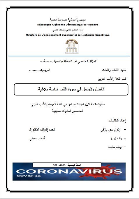 باركي إكرام ندى et al. (2021). الفصل والوصل في سورة القمر دراسة بلاغية (ليسانس- ل م د) . المركز الجامعي عبد الحفيظ بوالصوف ميلة.