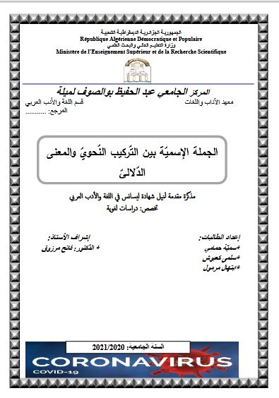 حمامي سمية et al. (2021). الجملة الإسمية بين التركيب النحوي والمعنى الدلالي (ليسانس- ل م د) . المركز الجامعي عبد الحفيظ بوالصوف ميلة.