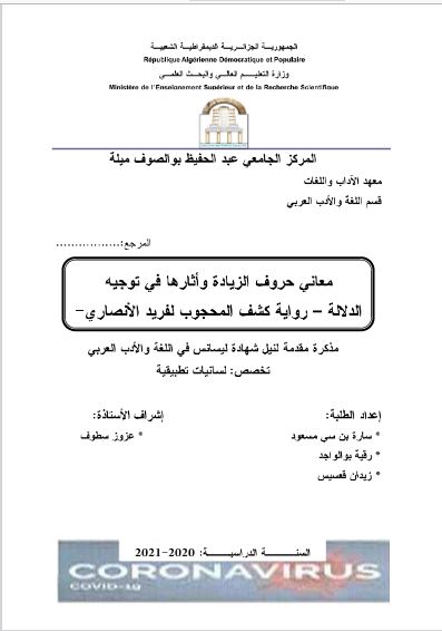بن سي مسعود سارة et al. (2021). معاني حروف الزيادة وأثارها في توجيه الدلالة -رواية كشف المحجوب لفريد الانصاري- (ليسانس- ل م د) . المركز الجامعي عبد الحفيظ بوالصوف ميلة.