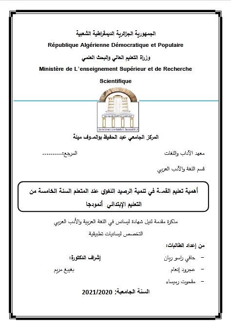 حافي راسو ريان et al. (2021). أهمية تعليم القصة في تنمية الرصيد اللغوي عند المتعلم السنة الخامسة من التعليم الإبتدائي أنمودجا (ليسانس- ل م د) . المركز الجامعي عبد الحفيظ بوالصوف ميلة.
