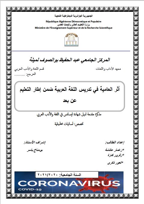 زغمار عائشة et al. (2021). أثر العامية في تدريس اللغة العربية ضمن إطار التعليم عن بعد (ليسانس- ل م د) . المركز الجامعي عبد الحفيظ بوالصوف ميلة.