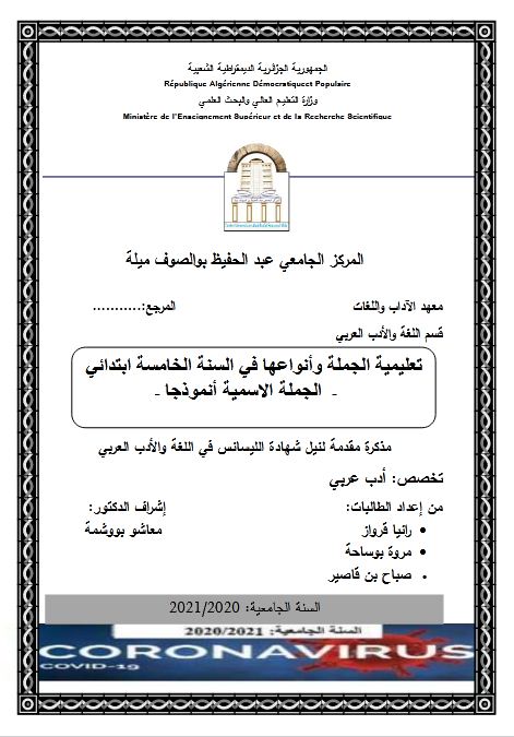قرواز رانيا et al. (2021). تعليمية الجملة وأنواعها في السنة الخامسة ابتدائي -الجملة الاسمية أنمودجا- (ليسانس- ل م د) . المركز الجامعي عبد الحفيظ بوالصوف ميلة.
