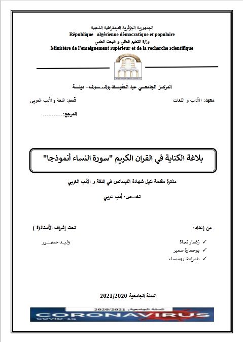 زغمار نجاة et al. (2021). بلاغة الكناية في القرآن الكريم سورة النساء أنمودجا (ليسانس- ل م د) . المركز الجامعي عبد الحفيظ بوالصوف ميلة.