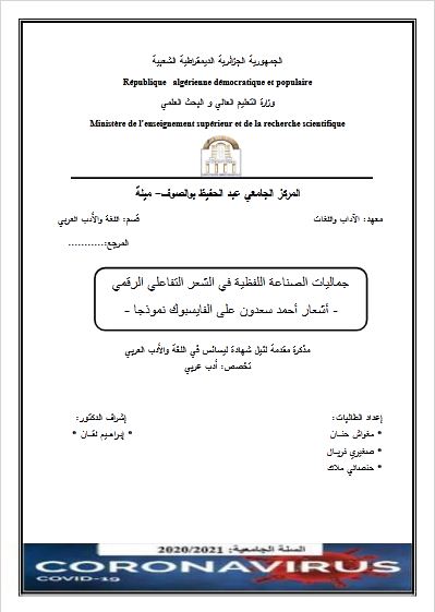 مغواش حنان et al. (2021). جماليات الصناعة اللفظية في الشعر التفاعلي الرقمي اشعار احمد سعدون على الفيسبوك نمودجا (ليسانس- ل م د) . المركز الجامعي عبد الحفيظ بوالصوف ميلة.